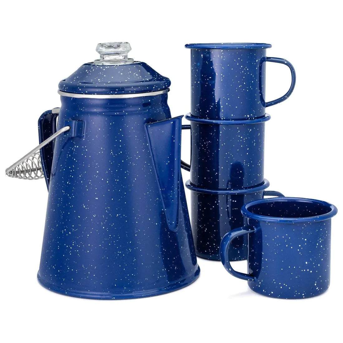 TIMELESS CRAFTSMANSHIP: Built from heavy-gauge steel, every piece of this stovetop coffee maker is kiln-hardened twice at 1,000℉. A handsome blue camping coffee pot built to last