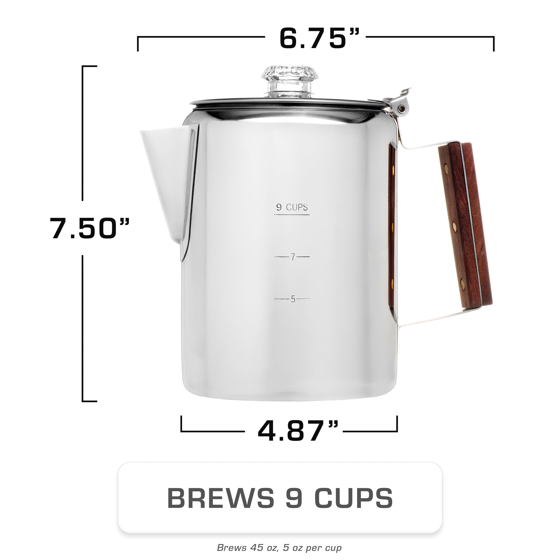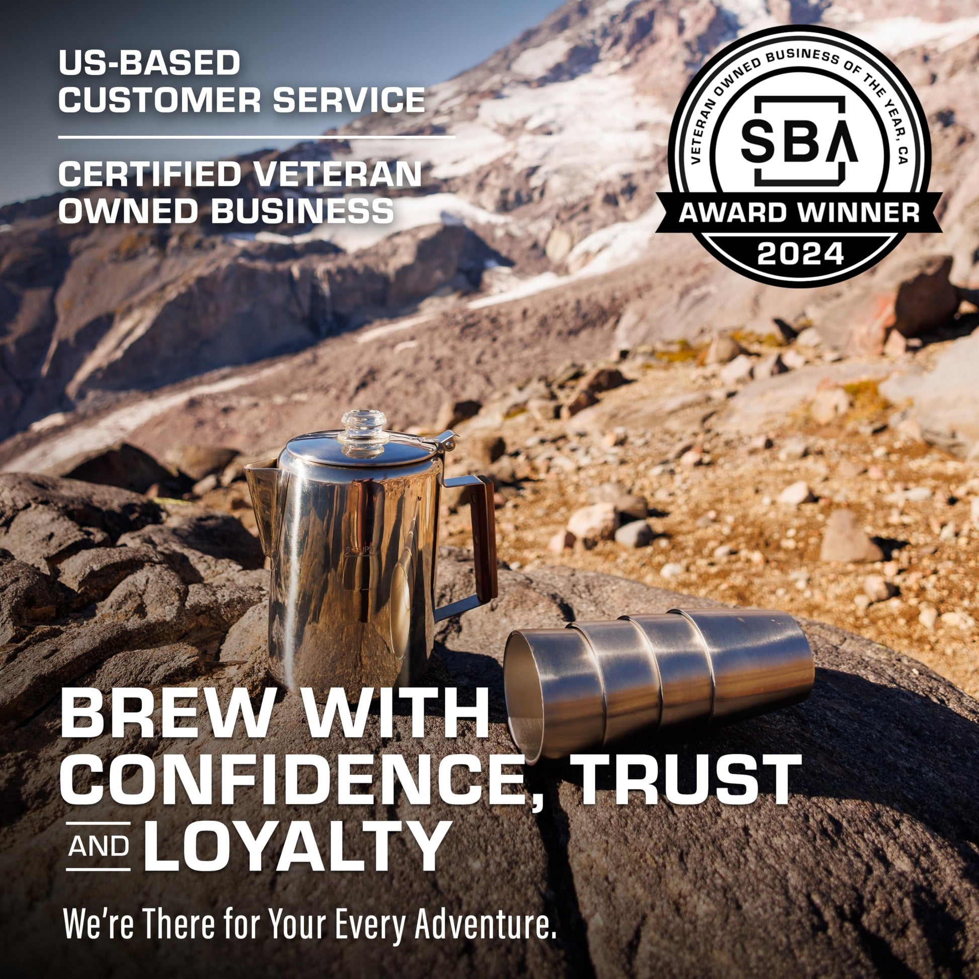 - NO ALUMINUM OR PLASTIC — Our camping coffee makers are toxin free, and make the best camp kitchen equipment. Don’t brew with lesser perculators that use aluminum and plastic. Choose a coffee percolator that will serve you well when you brew your camping coffee