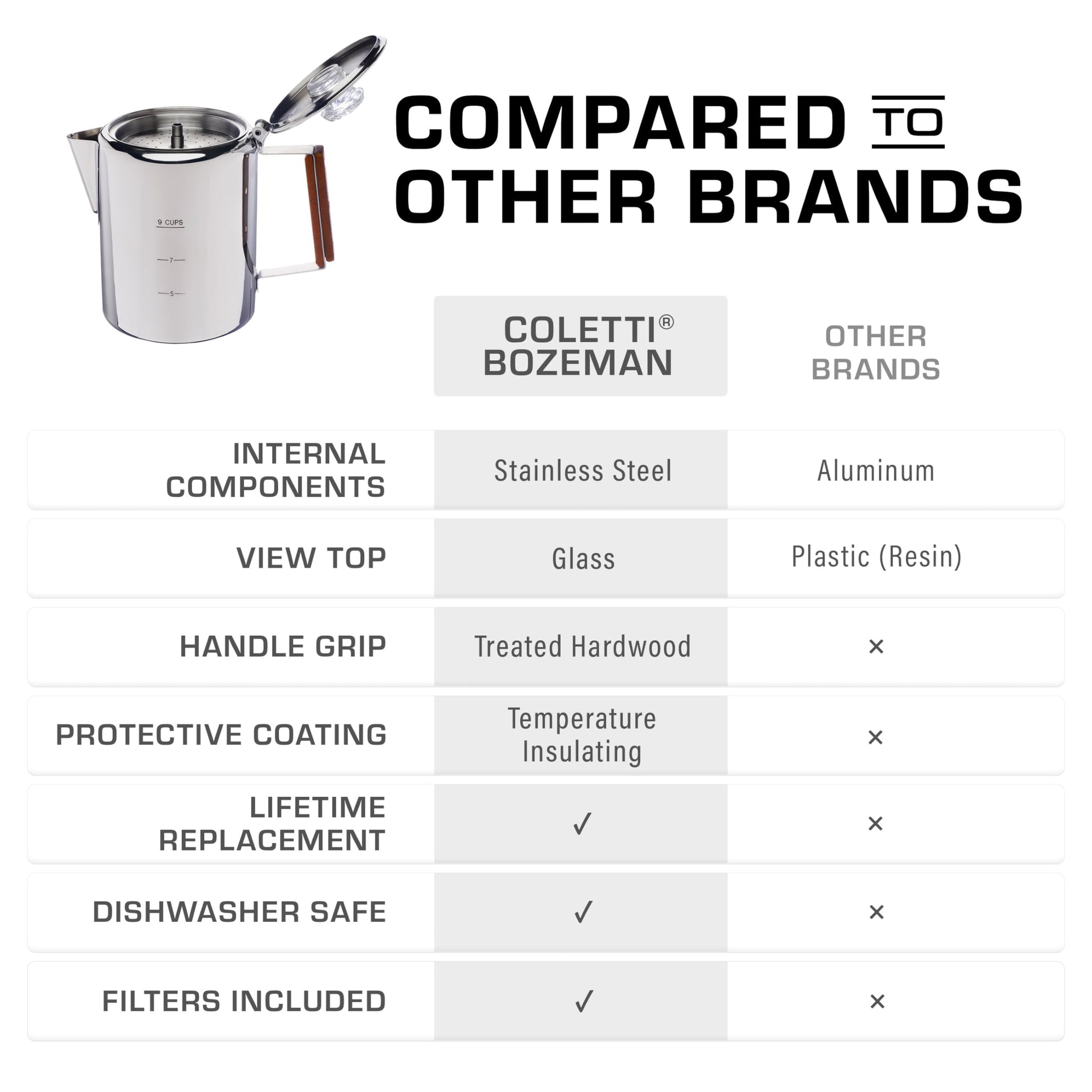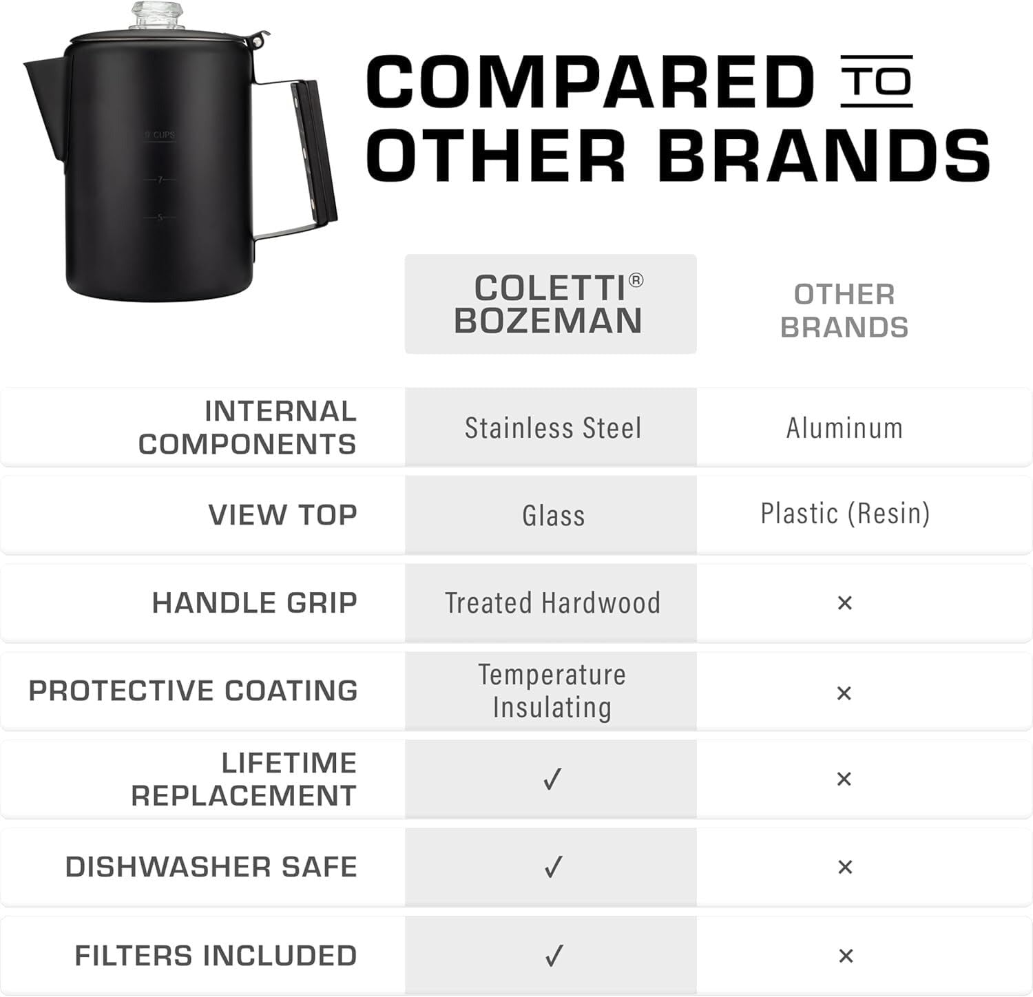 - LIFETIME REPLACEMENT GUARANTEE — Top materials & workmanship to deliver a premium guarantee to replace your percolator when damaged. Shop with confidence. This is the last camping percolator coffee pot you will ever need. US-based customer service available on weekdays. COLETTI is committed to every camper’s adventure, and we’re here to help you brew great coffee anywhere and everywhere you may be. So this summer, choose to brew with a good ol’ brand that you can trust. Brew Every Summer with COLETTI