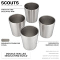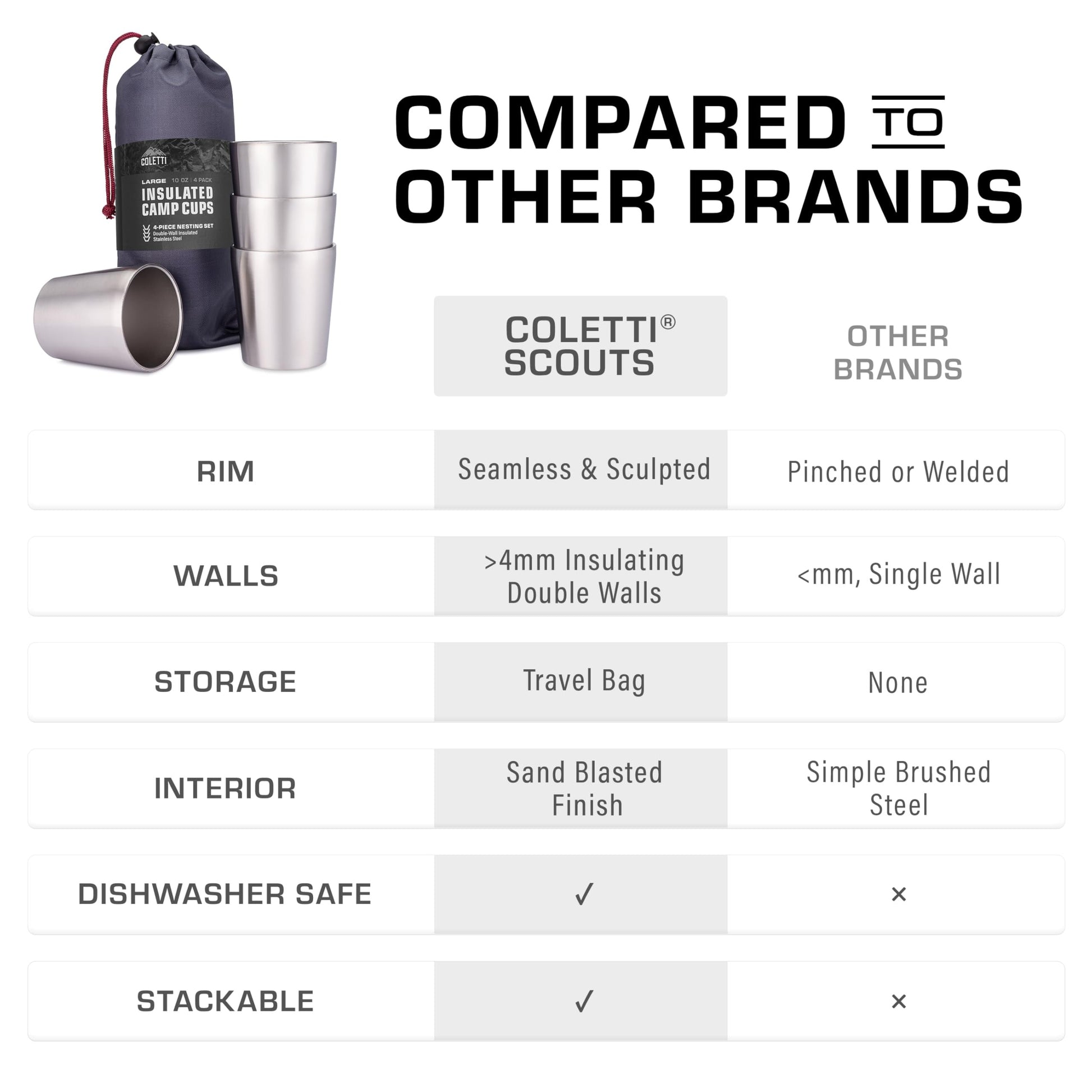 - DURABLE METAL CUPS — Our stackable cups are made of reinforced and corrosion resistant stainless steel. This double walled camping cup is built tough by combat veterans. No dents, no problems, no compromises when you’re camping with COLETTI