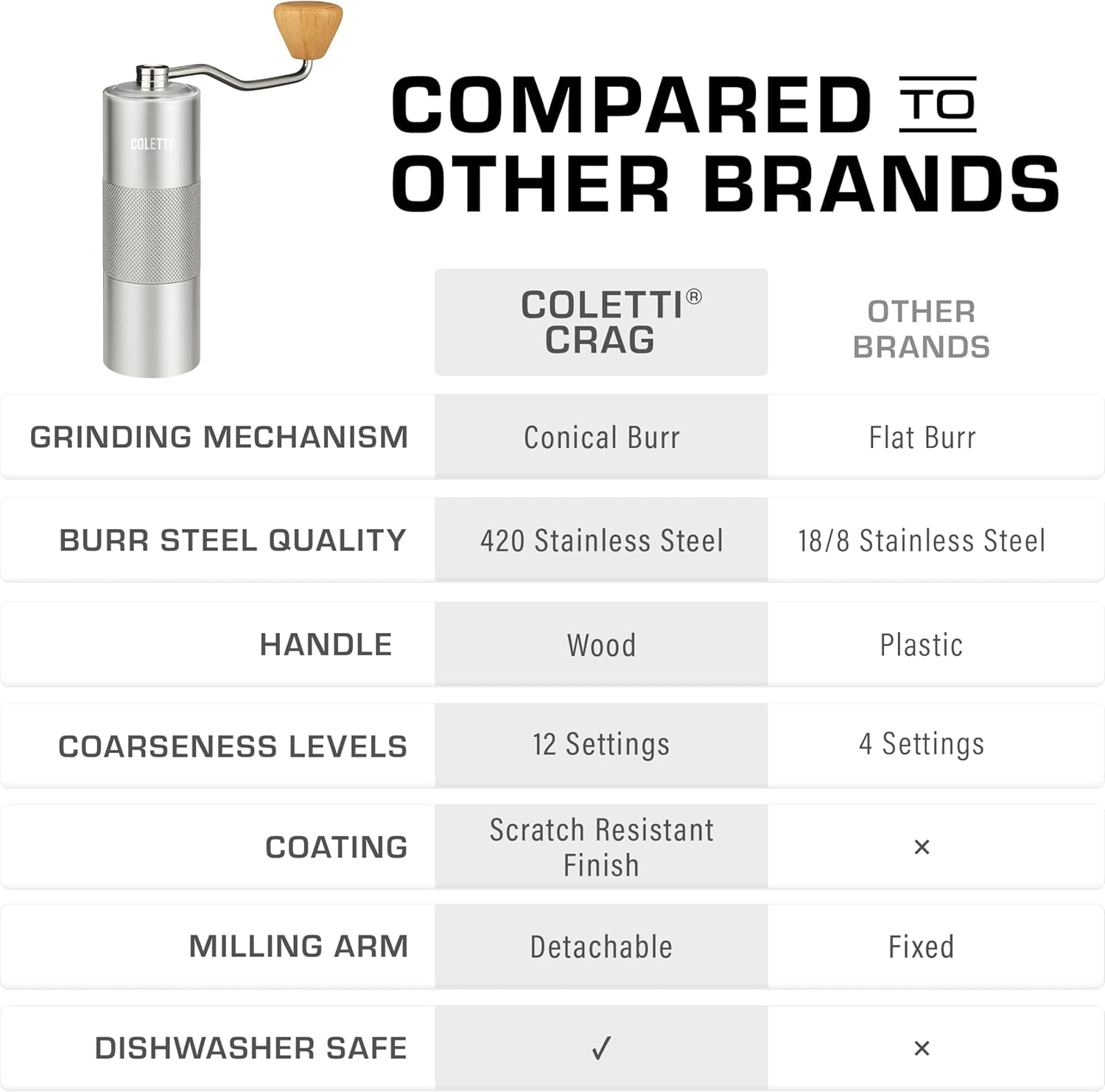 - GOES WHERE YOU GO: Bring this hand burr coffee grinder on the road or up a mountain. That way you can have handground precision coffee anywhere in the world. COLETTI is a camping company, so you can trust our gear to travel