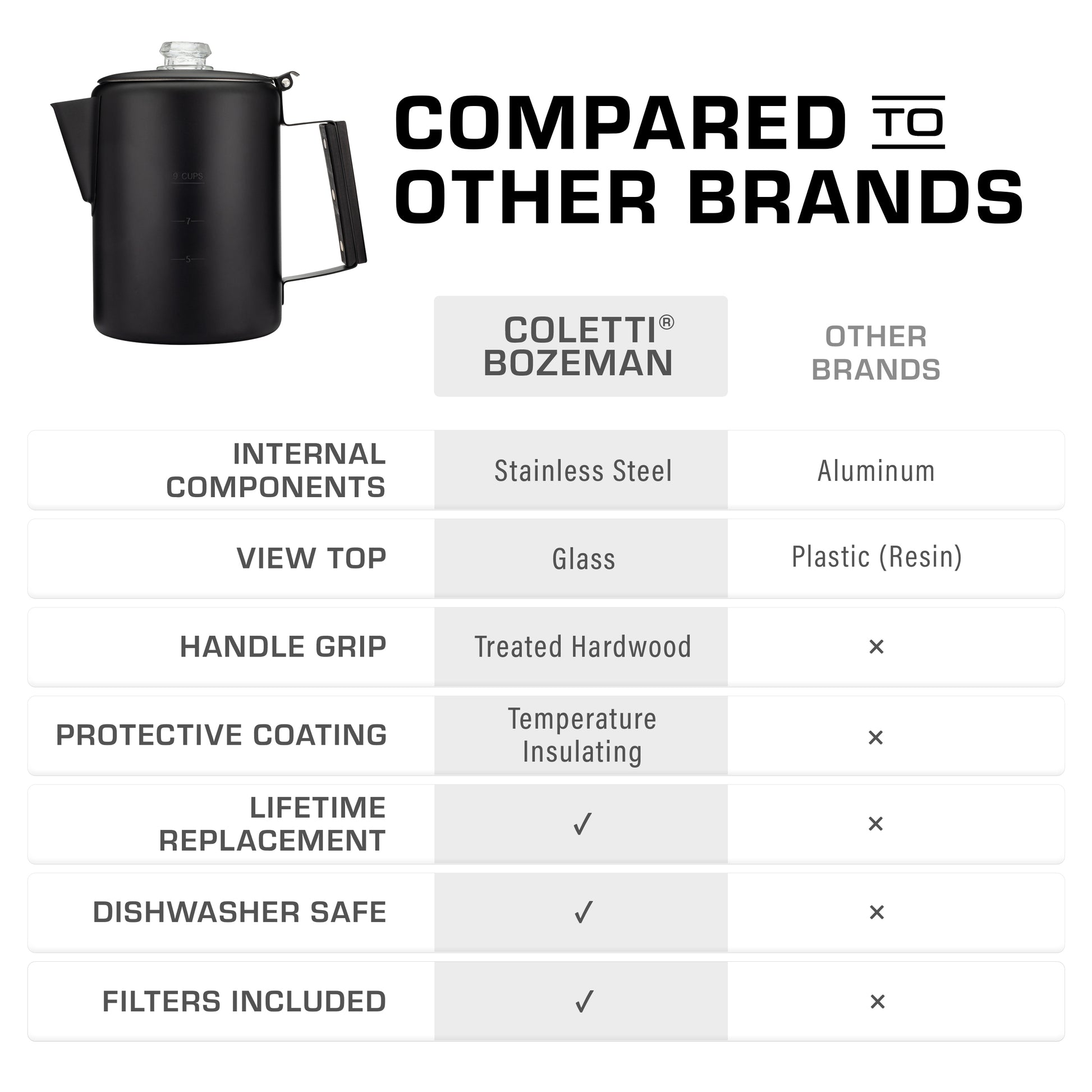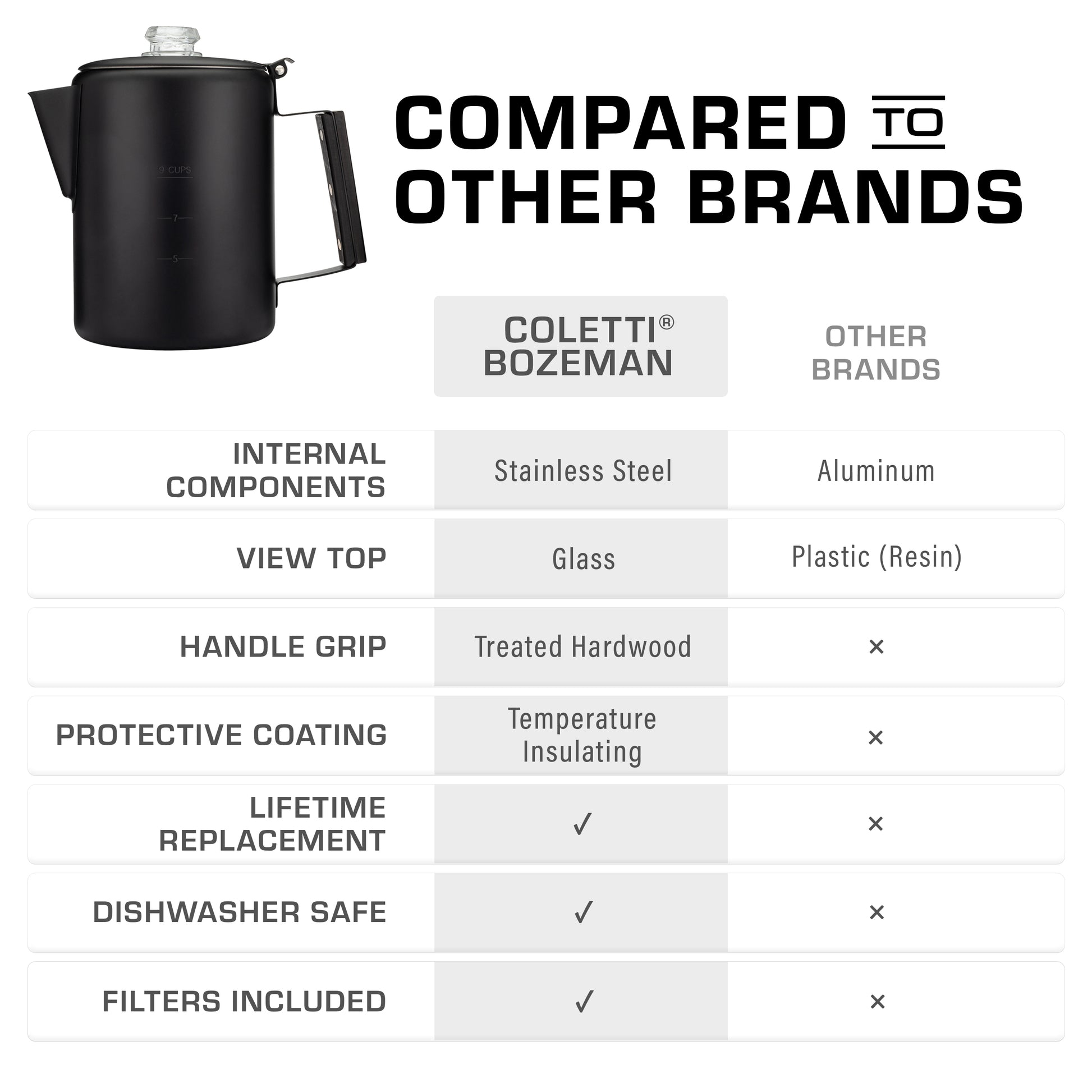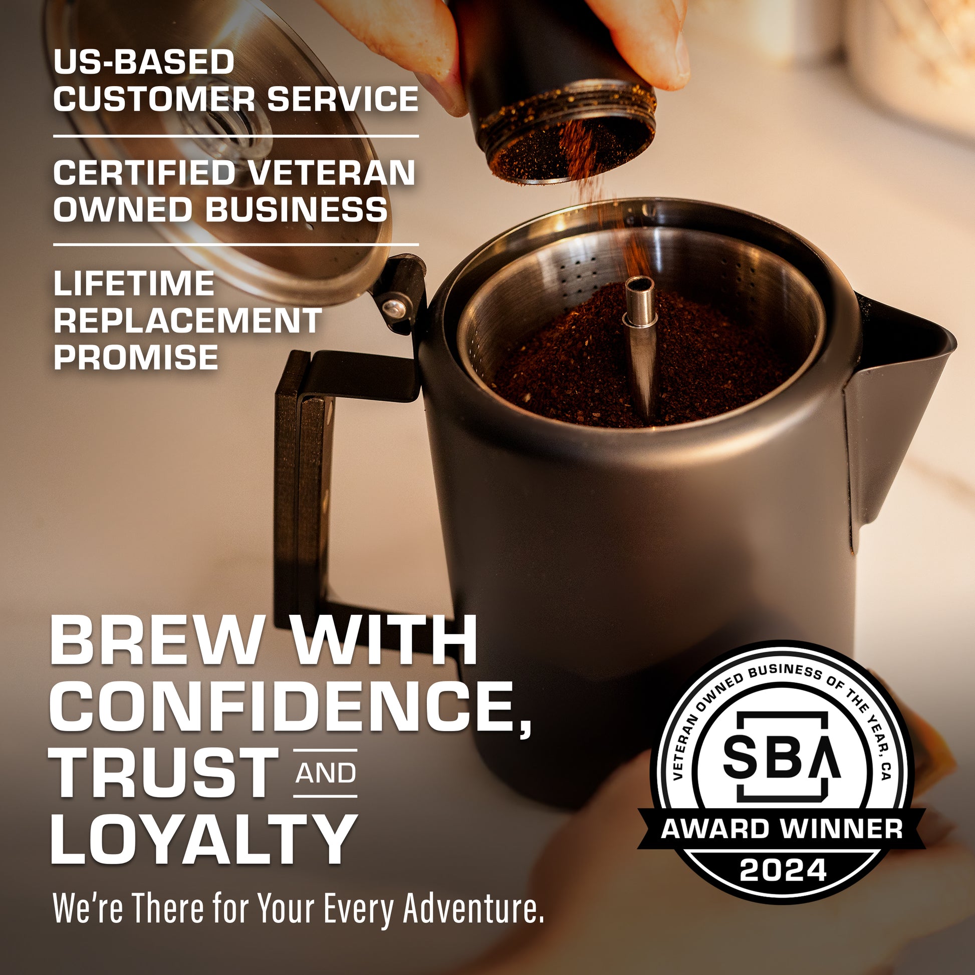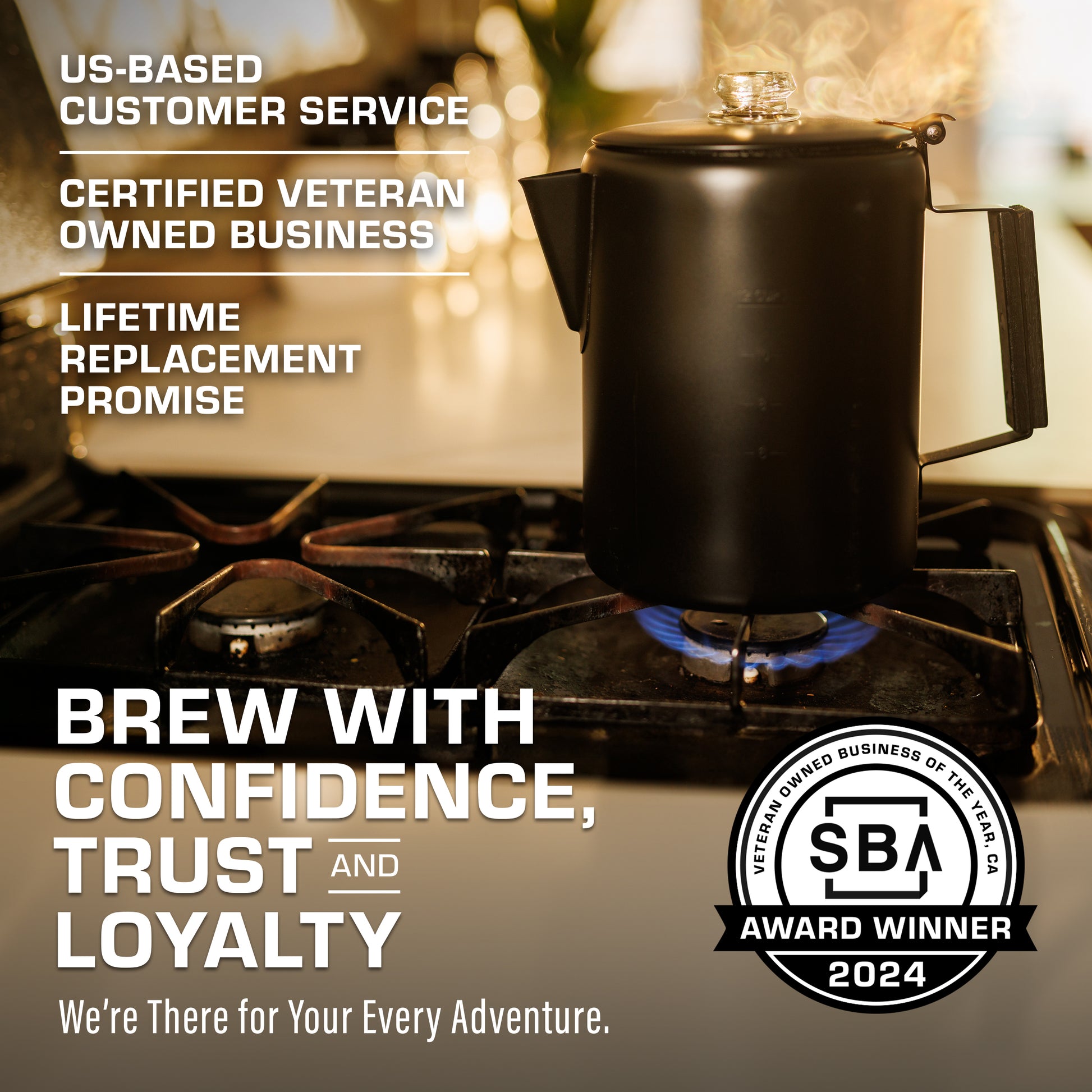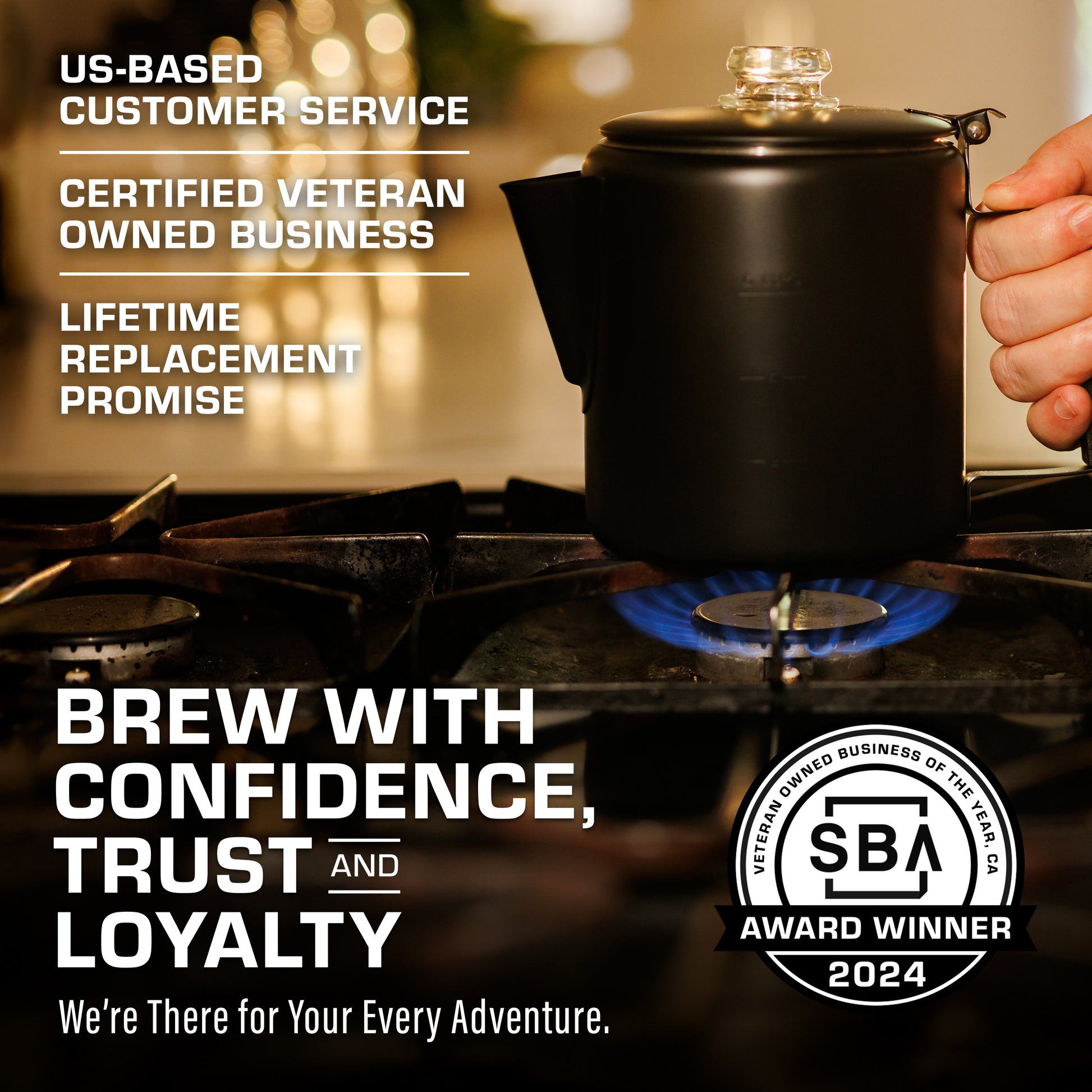- LIFETIME REPLACEMENT GUARANTEE – A camping coffee pot should last a lifetime, and this one will. If it ever fails, we'll replace it. Built for adventure, backed for life. As a veteran-owned company, COLETTI stands behind every coffee percolator we make. Wherever the road takes you, this percolator is ready—Make Great Coffee Anywhere