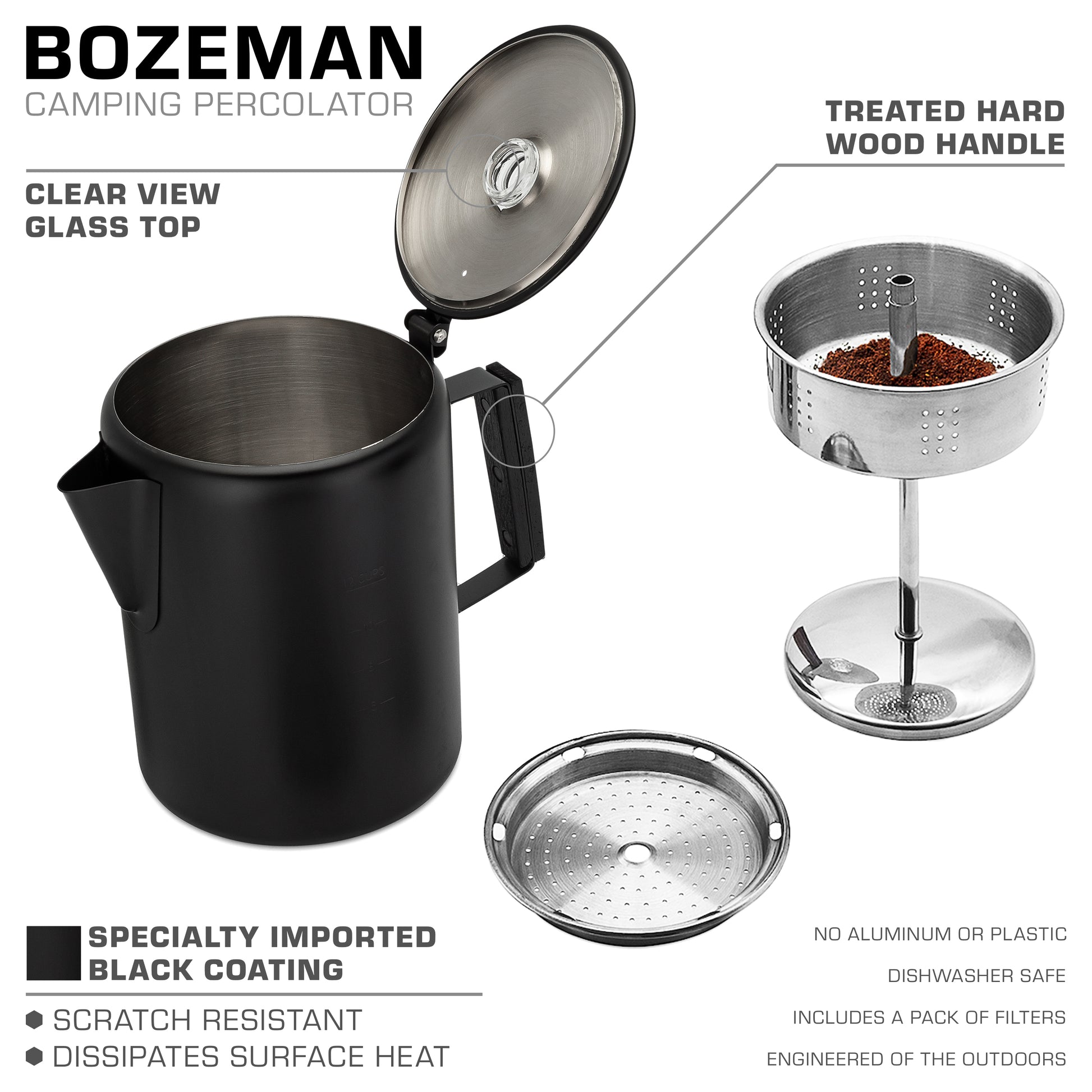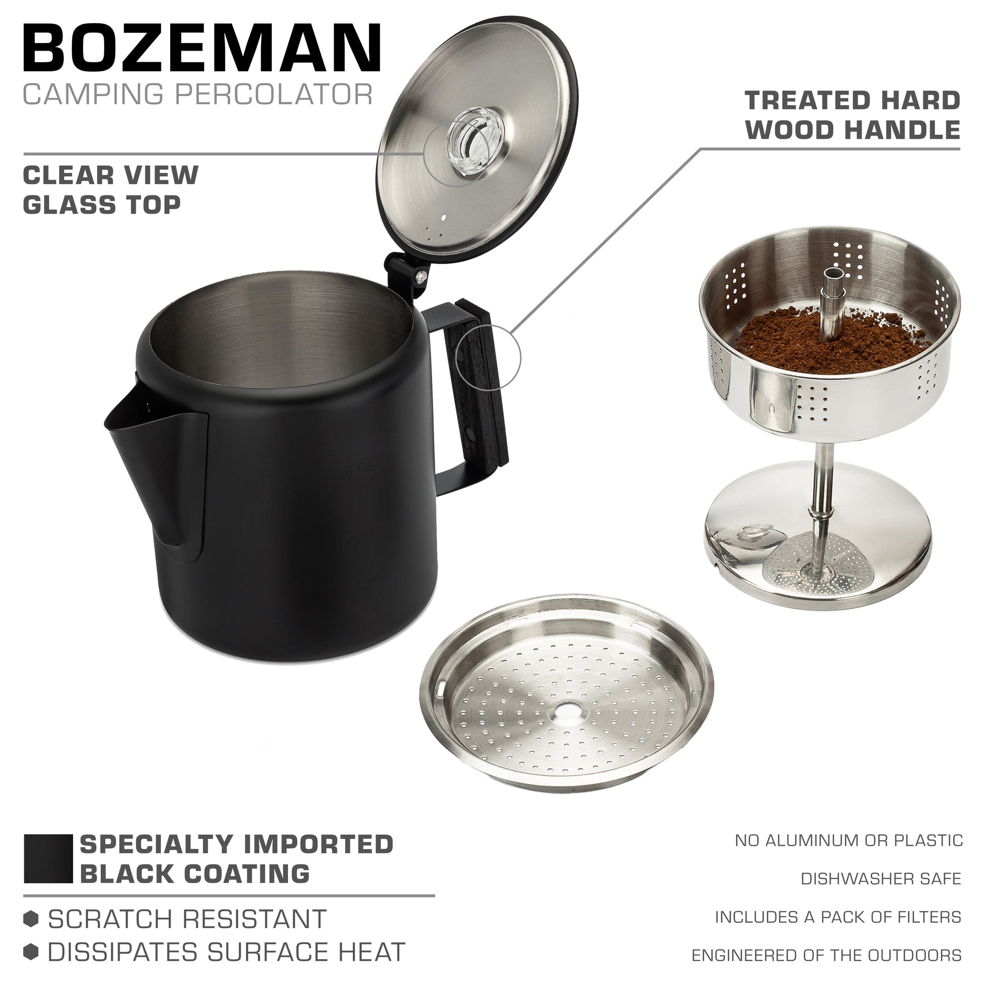 - QUICK CLEANING ON THE TRAIL – Pack up, rinse out, and keep moving. The Bozeman percolator coffee pot stovetop is built for the most demanding trails—no fragile parts, no complicated cleanup. A quick rinse, and it's ready for the next sunrise. Dishwasher safe at home, effortless in the wild. Includes a pack of filters for a smoother cup, because good coffee deserves a little extra care.