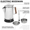 - MODERN PERFORMANCE, CLASSIC TASTE — Unlike plastic-laden drip machines, our percolator extracts deep, rich flavor the old-fashioned way—by cycling hot water through grounds for a full-bodied brew. Now powered by electricity, it’s perfect for those who want café-quality coffee with modern ease.