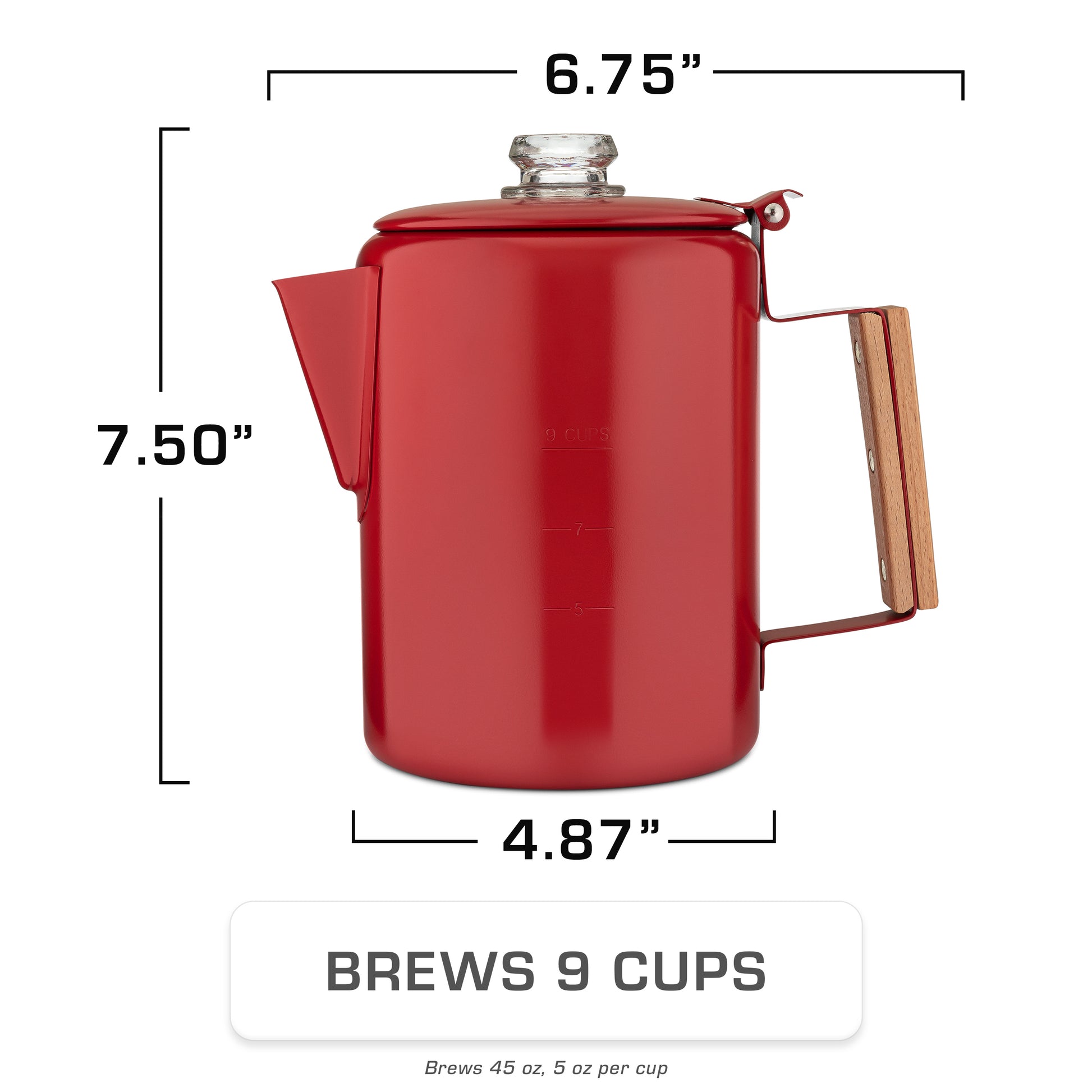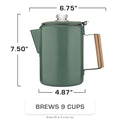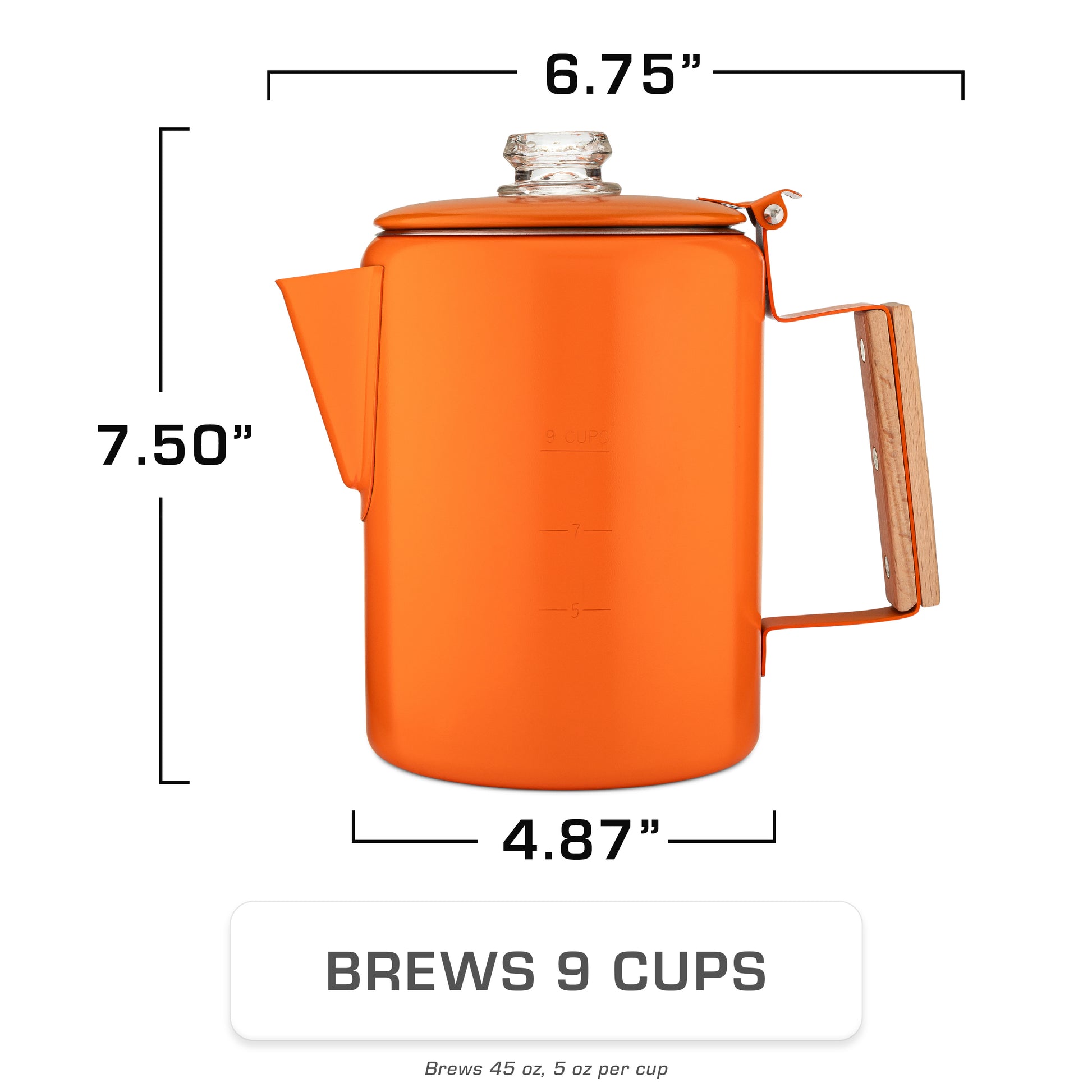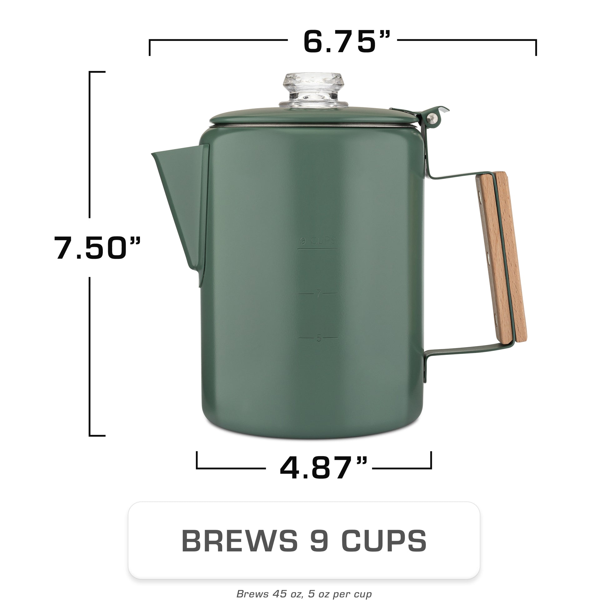 - PROTECTIVE GREEN COATING — We coated an already sturdy & durable percolator to make our sleekest looking coffee maker yet. Brew in style and make your bold camping coffee in something really cool lookin’