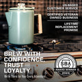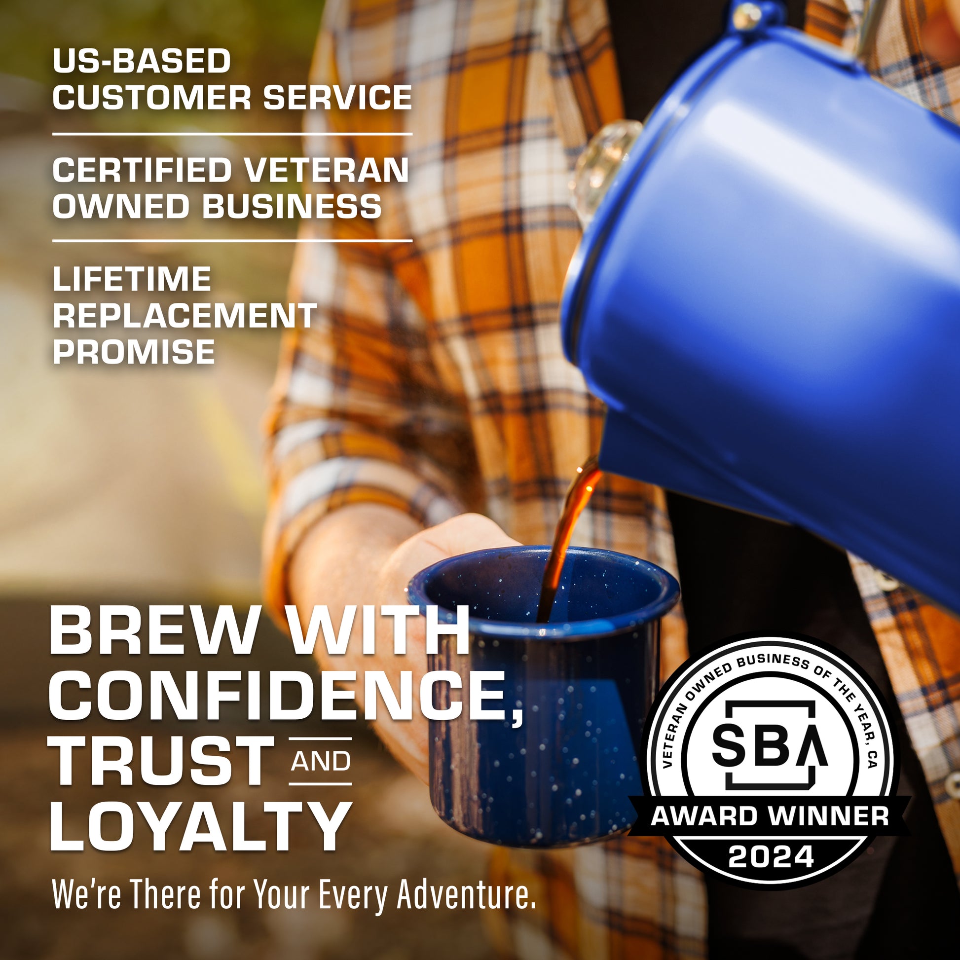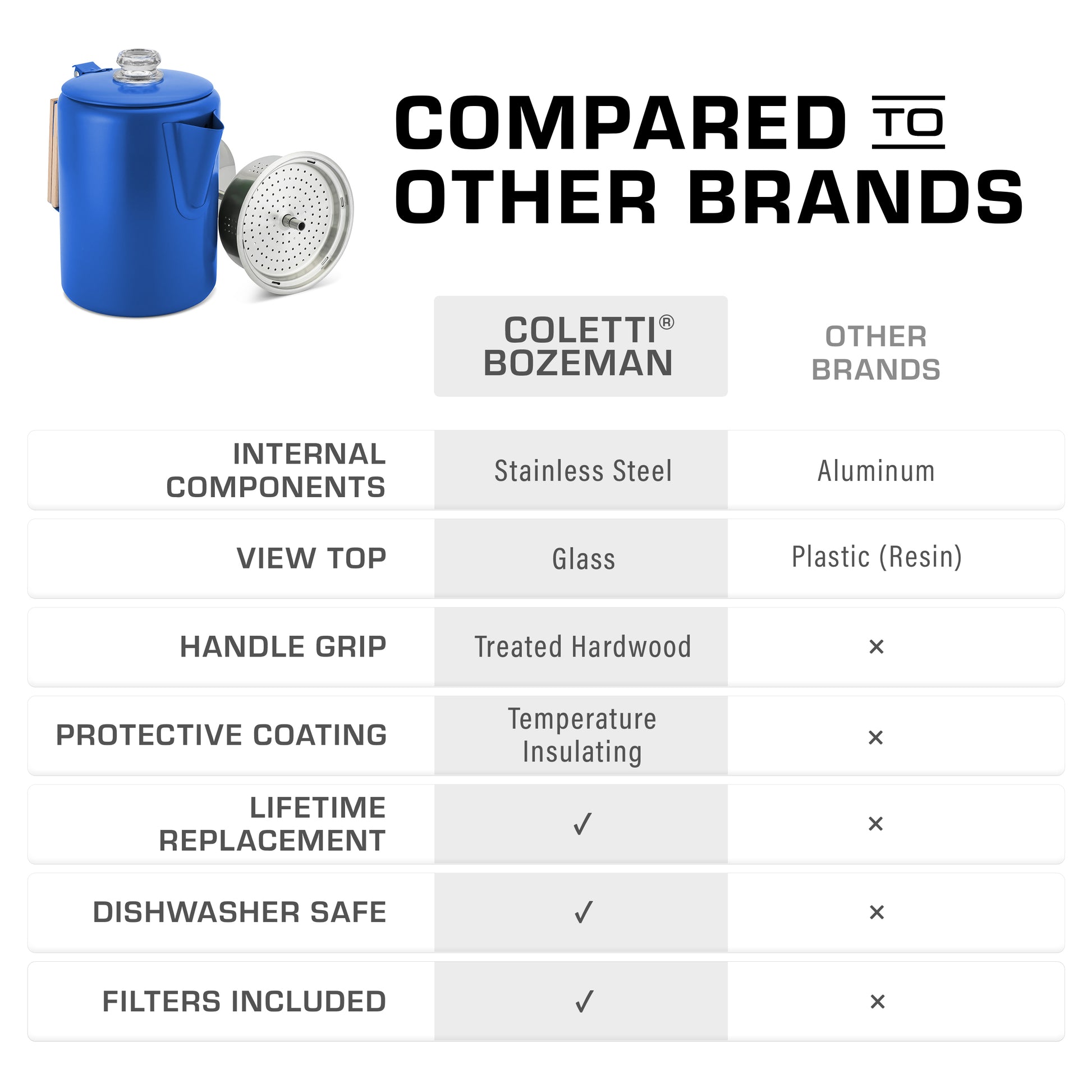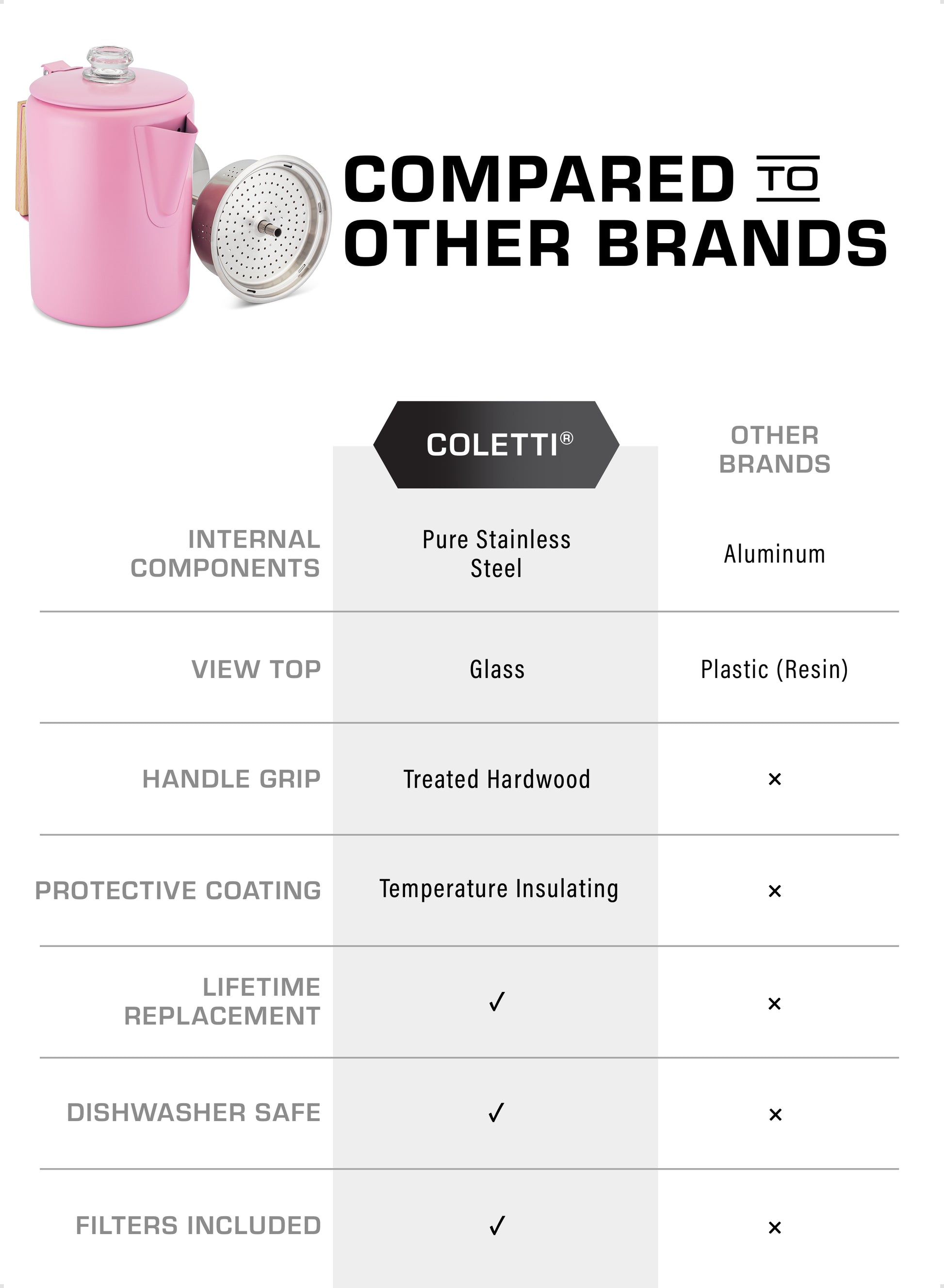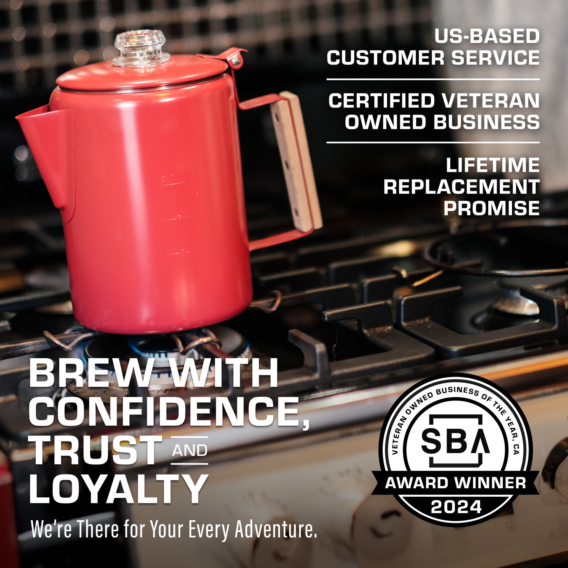 - LIFETIME REPLACEMENT GUARANTEE – A camping coffee pot should last a lifetime, and this one will. If it ever fails, we'll replace it. Built for adventure, backed for life. As a veteran-owned company, COLETTI stands behind every coffee percolator we make. Wherever the road takes you, this percolator is ready—Make Great Coffee Anywhere