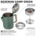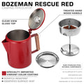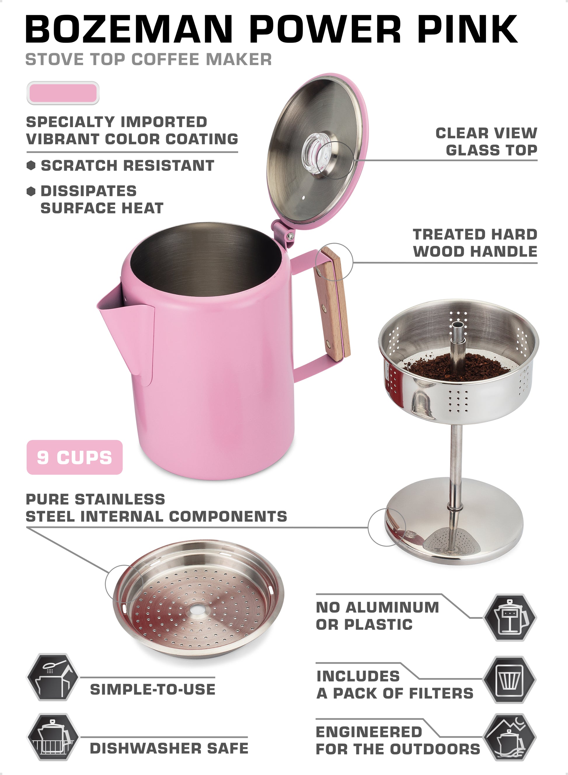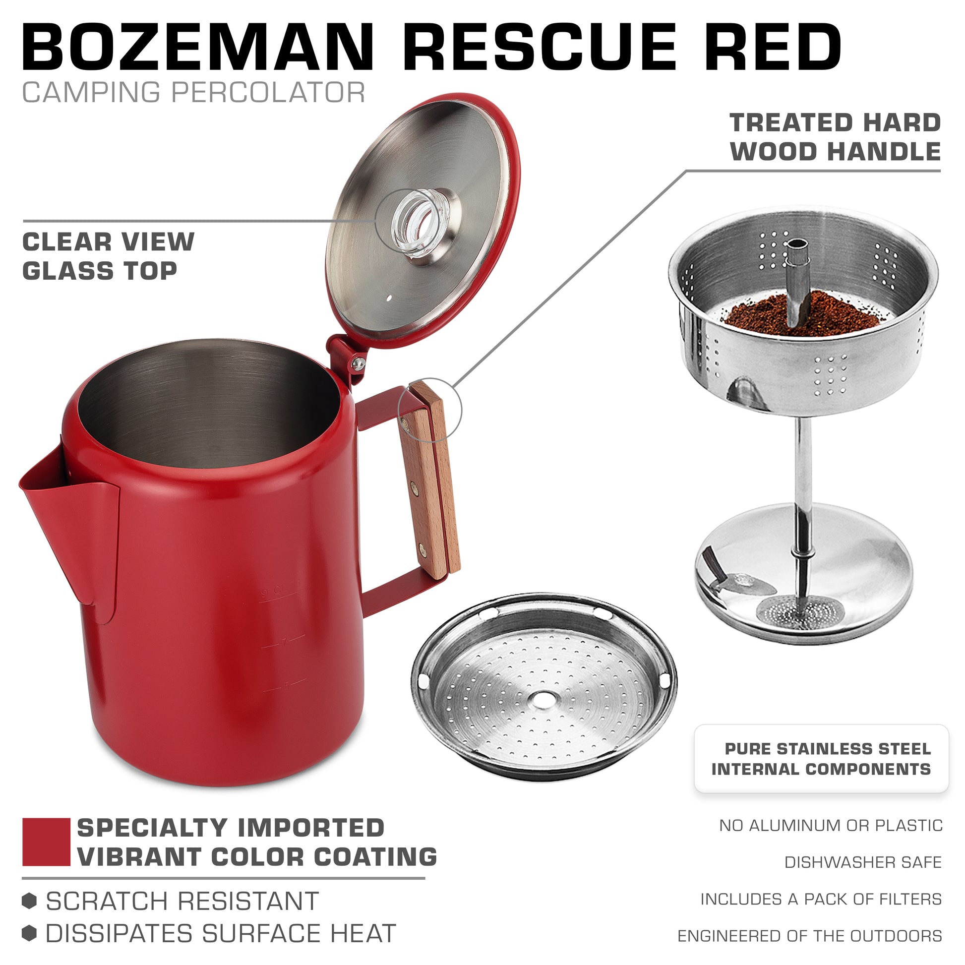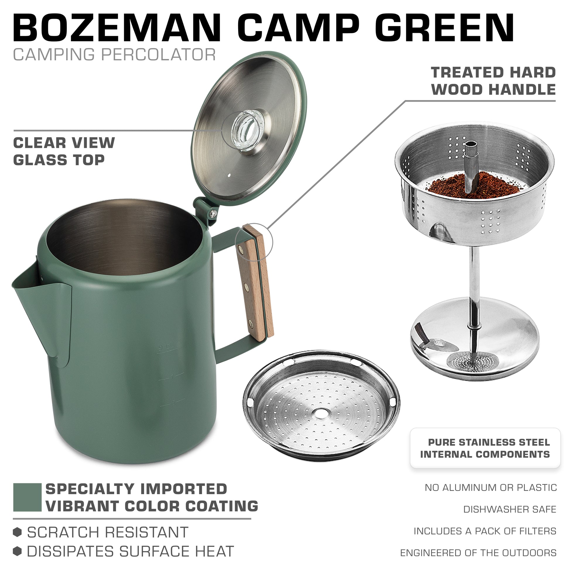 - QUICK CLEANING ON THE TRAIL – Pack up, rinse out, and keep moving. The Bozeman percolator coffee pot stovetop is built for the most demanding trails—no fragile parts, no complicated cleanup. A quick rinse, and it's ready for the next sunrise. Dishwasher safe at home, effortless in the wild. Includes a pack of filters for a smoother cup, because good coffee deserves a little extra care.