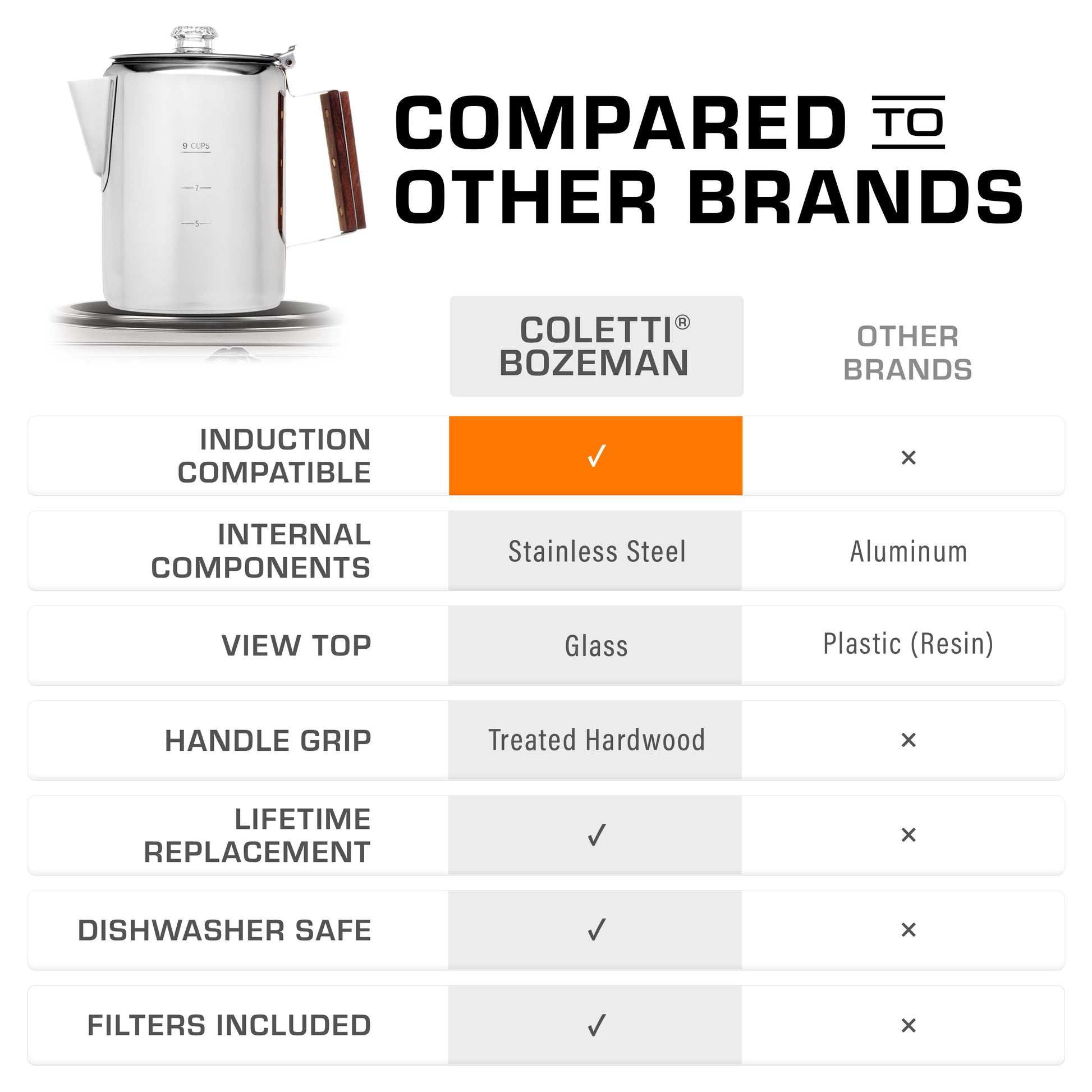 - BREW 3 DIFFERENT WAYS: FIRE - STOVE - & INDUCTION — The newest improvement in percolator technology, brought to you by the makers of ‘America’s Favorite Camping Coffee Pot.’ Now you can brew on a grill, a hotplate, and an induction stove all with the same percolator. Now you can truly – Make Great Coffee Anywhere