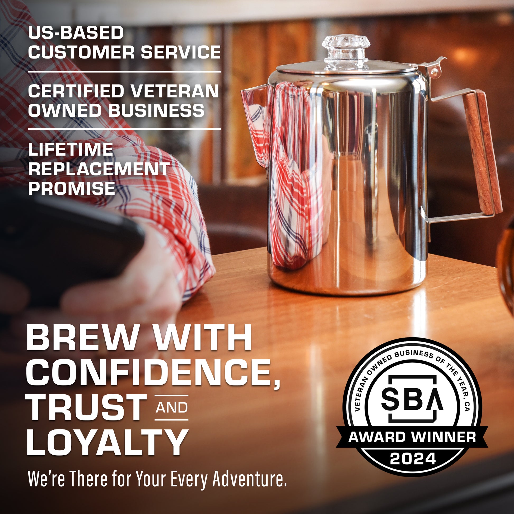 - LIFETIME REPLACEMENT GUARANTEE — Top materials & workmanship to deliver a premium guarantee to replace your percolator when damaged. Shop with confidence. This is the last camping percolator coffee pot you will ever need. US-based customer service available on weekdays. COLETTI is committed to every camper’s adventure, and we’re here to help you brew great coffee anywhere and everywhere you may be. So this summer, choose to brew with a good ol’ brand that you can trust. Brew Every Summer with COLETTI.