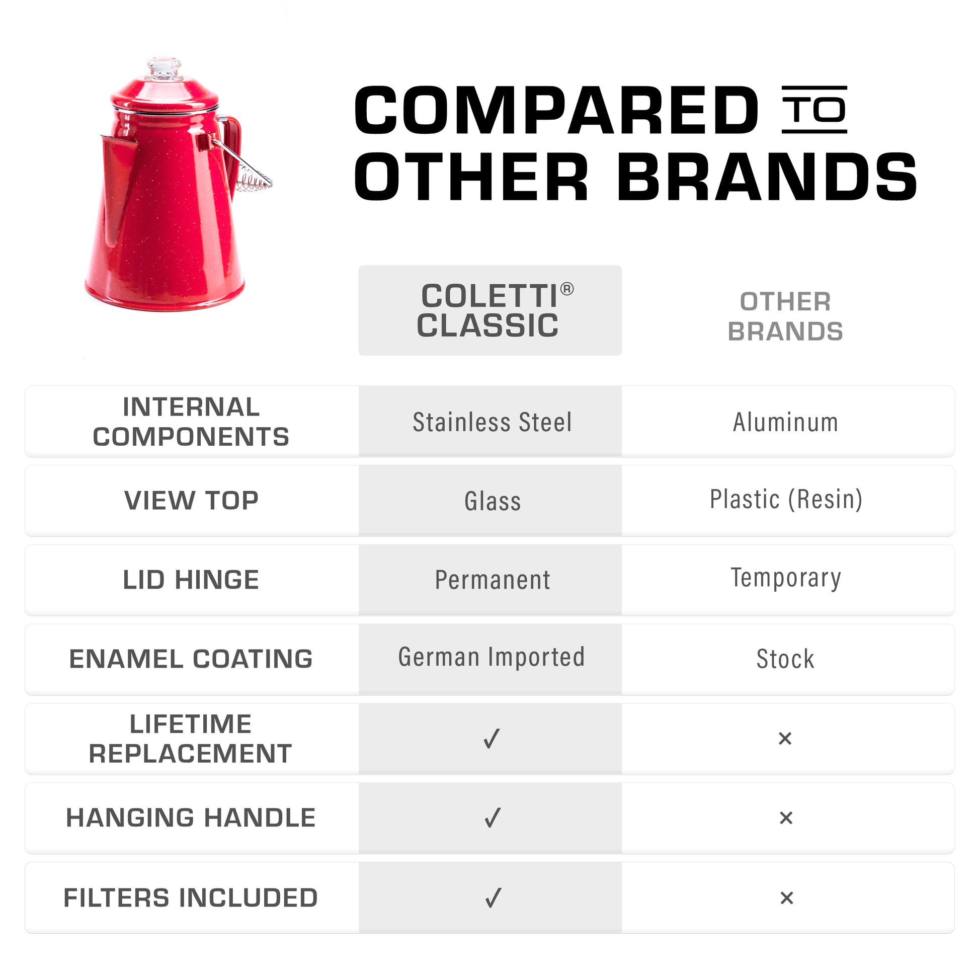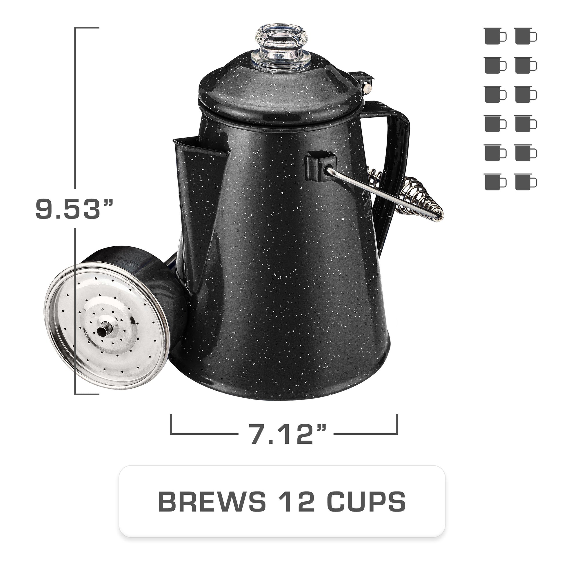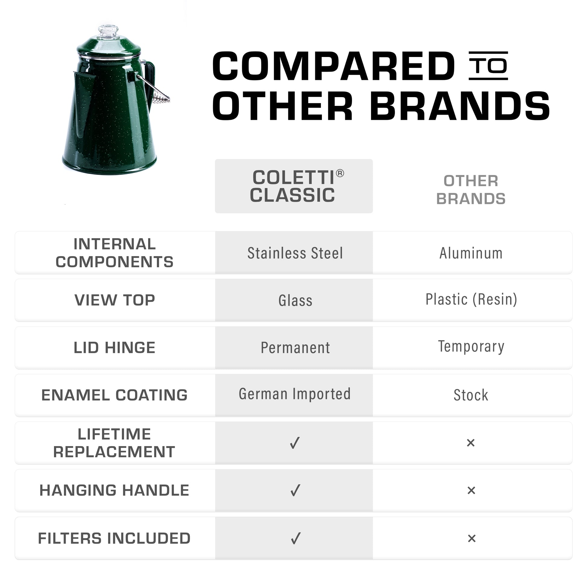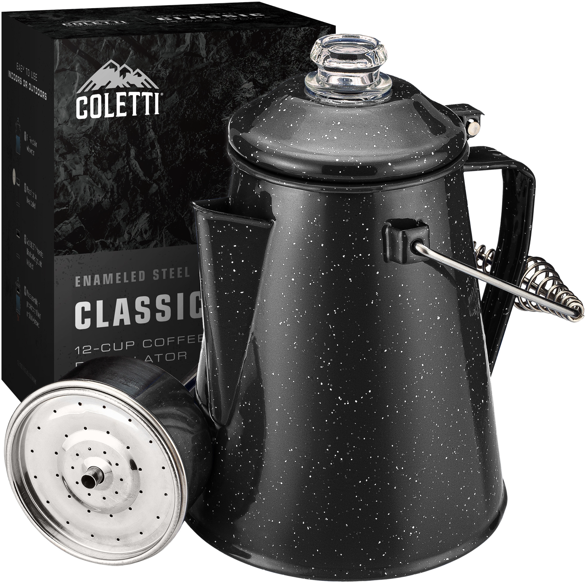 - CAMPING COFFEE MADE EASY – A percolator coffee pot is simple, efficient, & classic. When you want something strong, and it’s too early for beer, brew with a COLETTI Classic (NOTE: 1 coffee cup equals 6 fl oz). Your Perfect Cowboy Coffee Pot