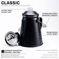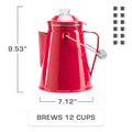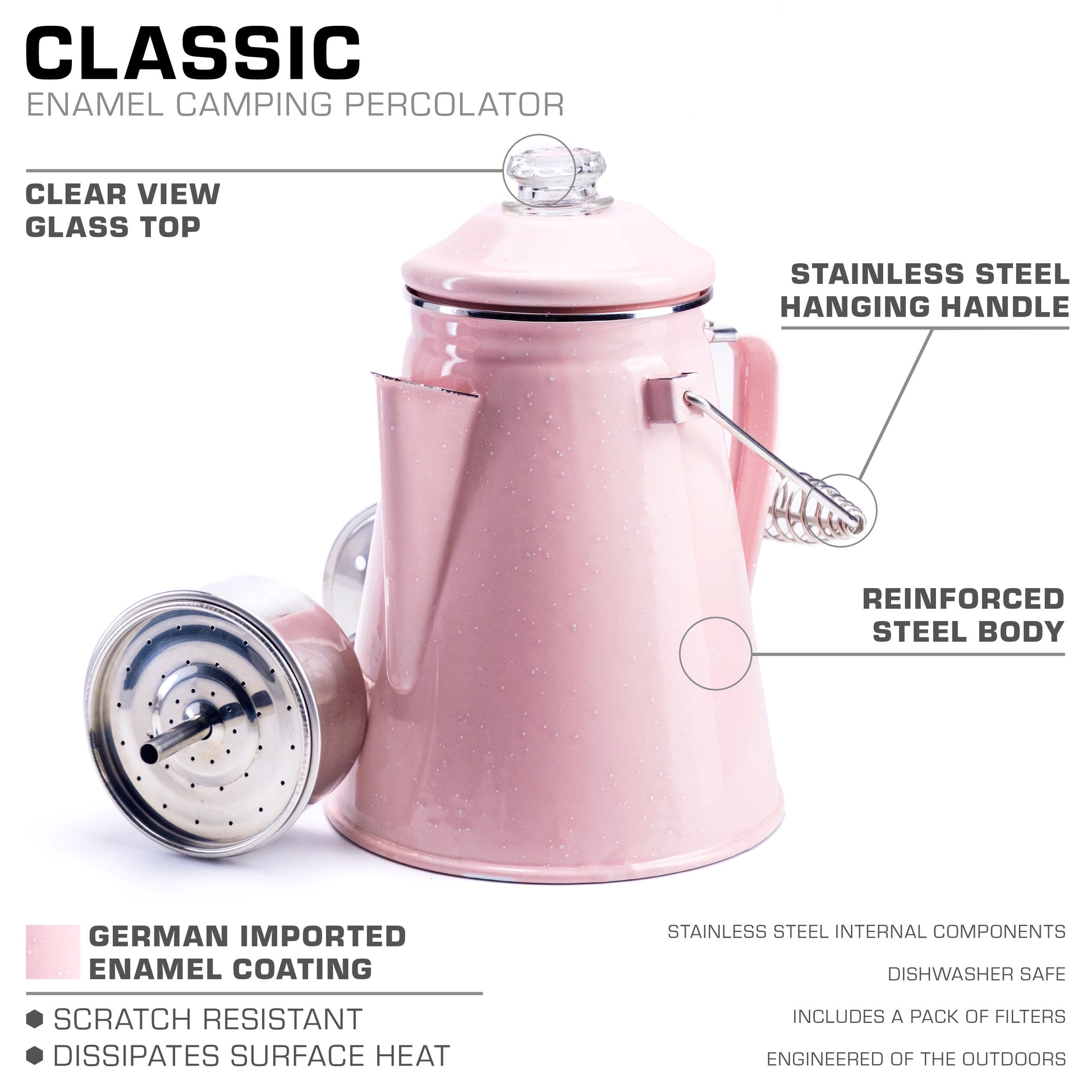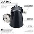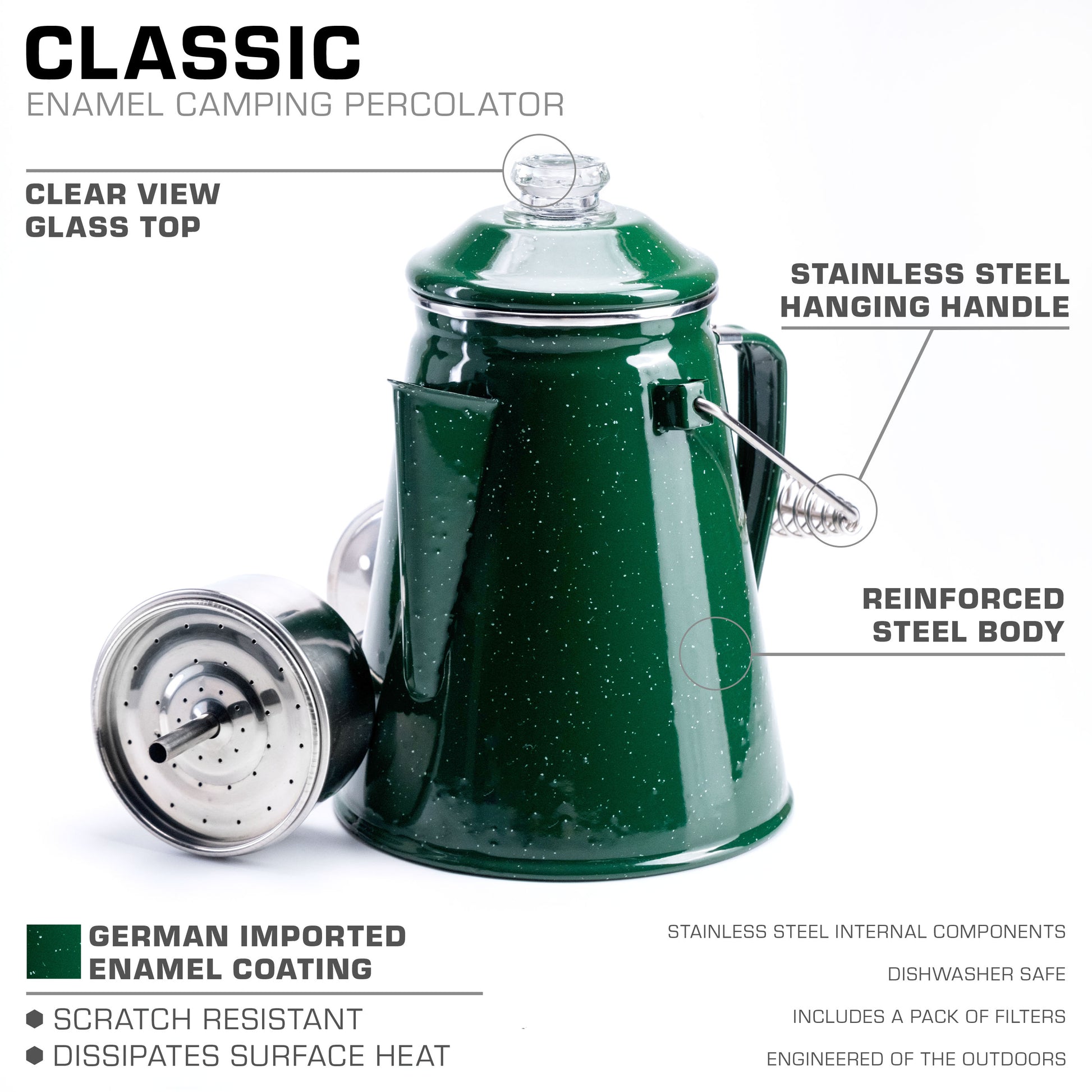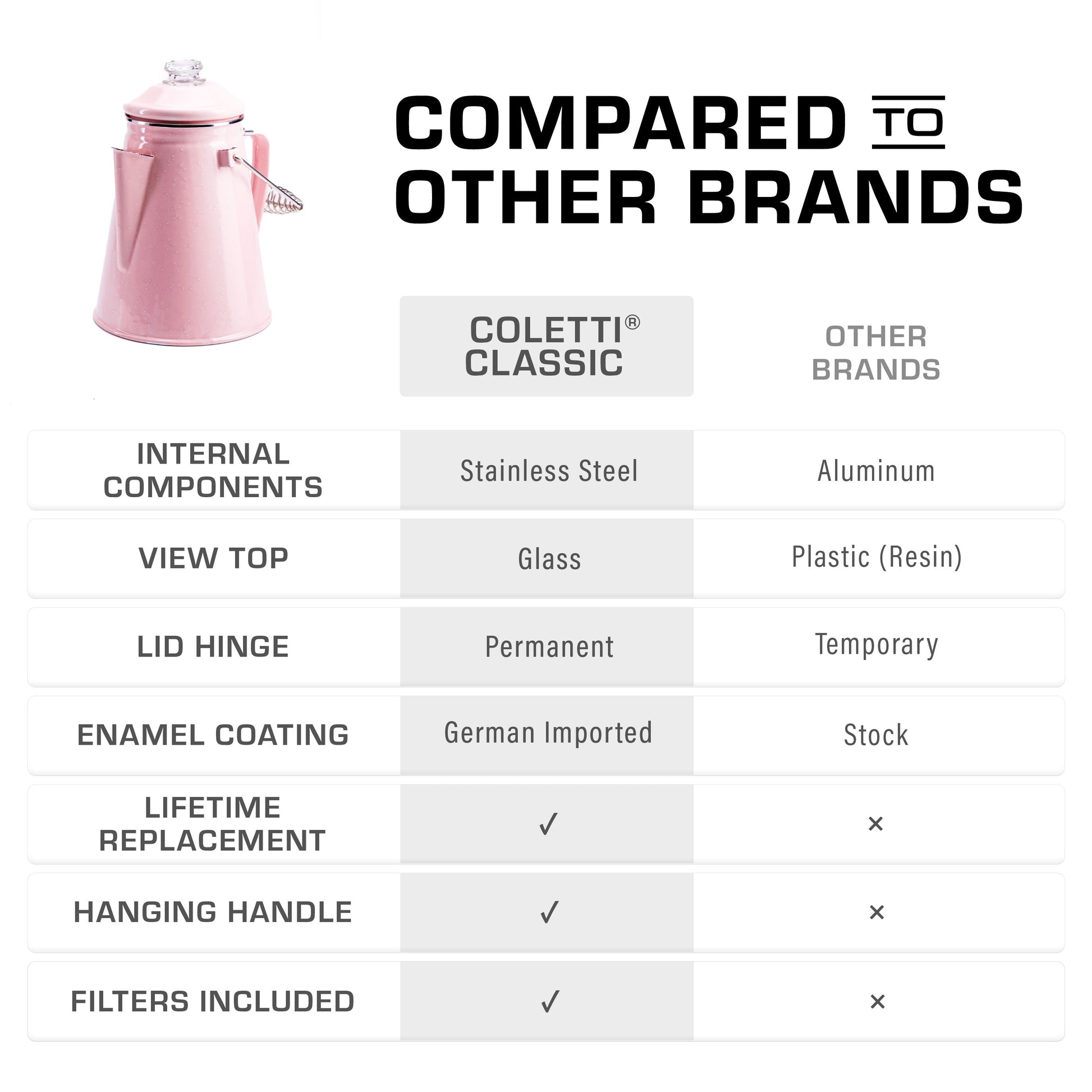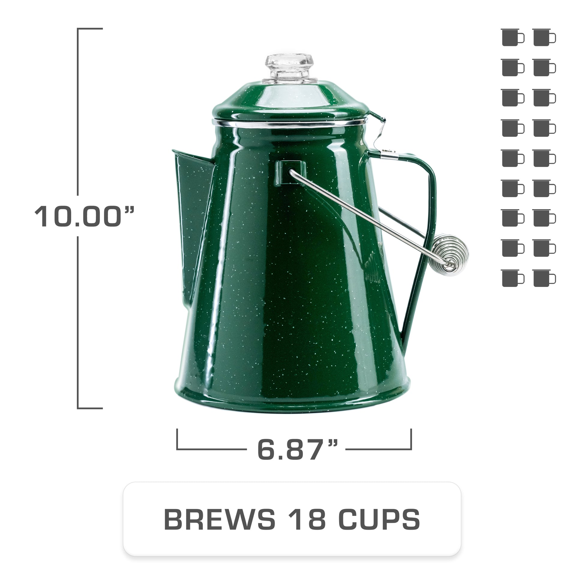 - CAMPING COFFEE MADE EASY – A percolator coffee pot is simple, efficient, & classic. When you want something strong, and it’s too early for beer, brew with a COLETTI Classic (NOTE: 1 coffee cup equals 6 fl oz). Your Perfect Cowboy Coffee Pot