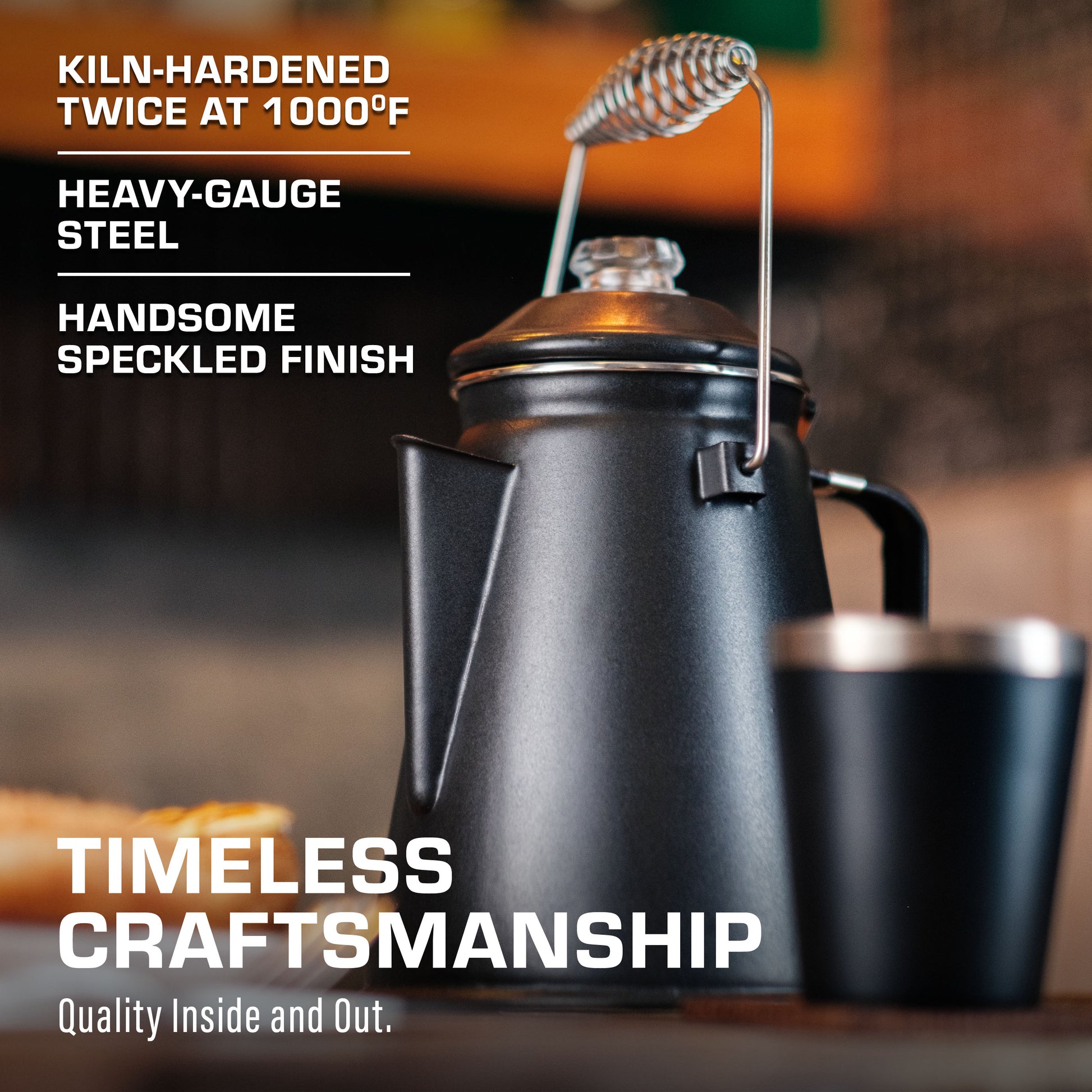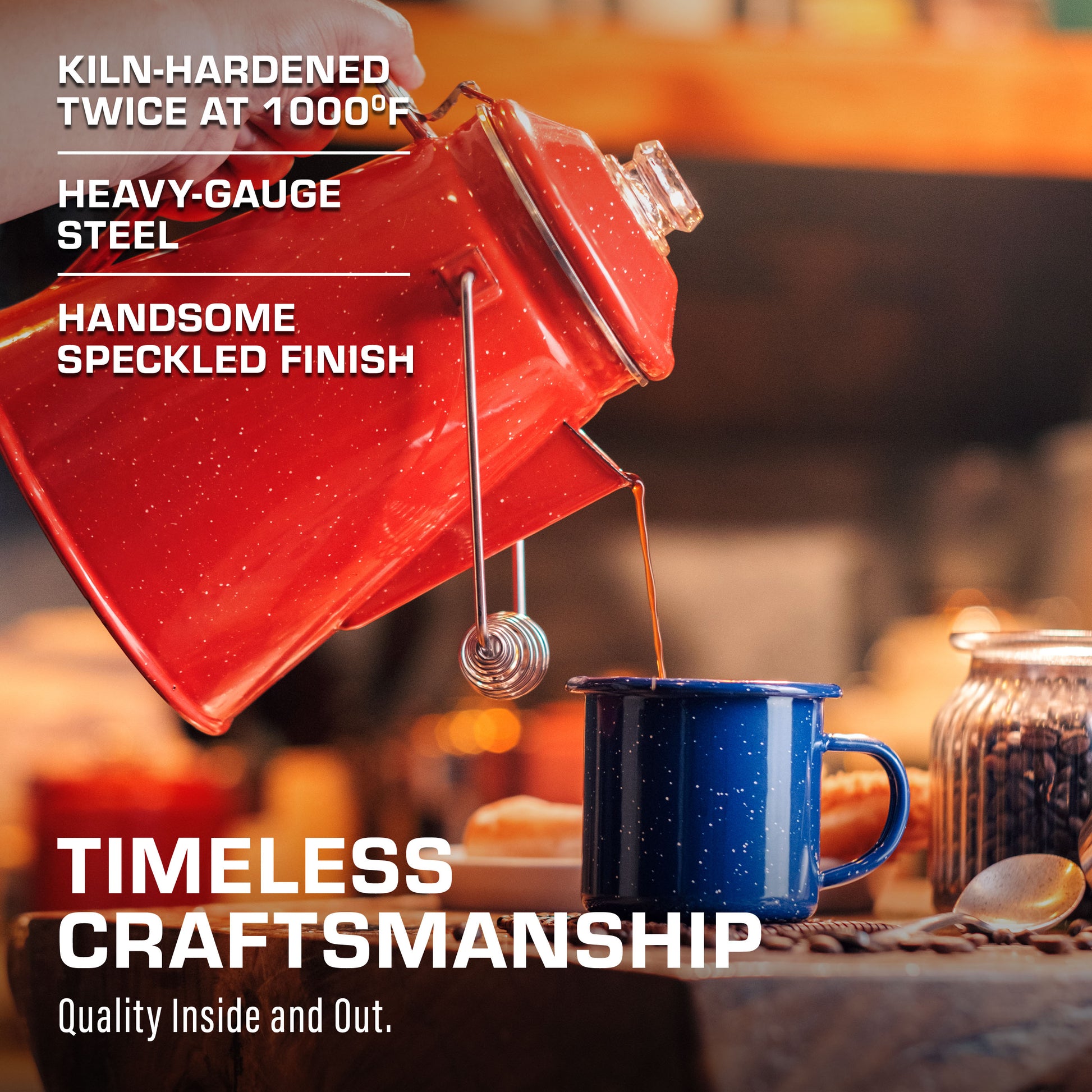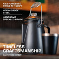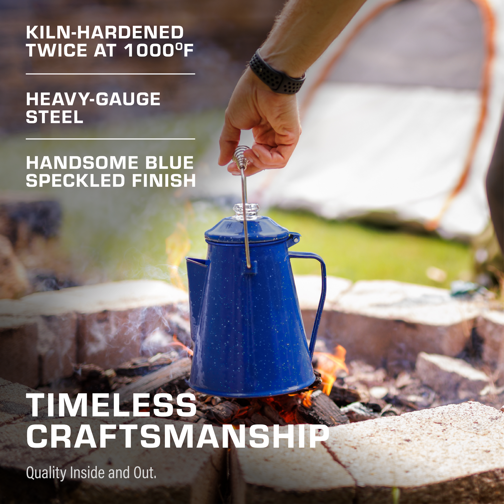 - TIMELESS CRAFTSMANSHIP – Built from heavy-gauge steel, every piece of this stovetop coffee maker is kiln-hardened twice at 1,000℉. A handsome blue camping coffee pot built to last
