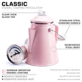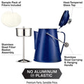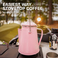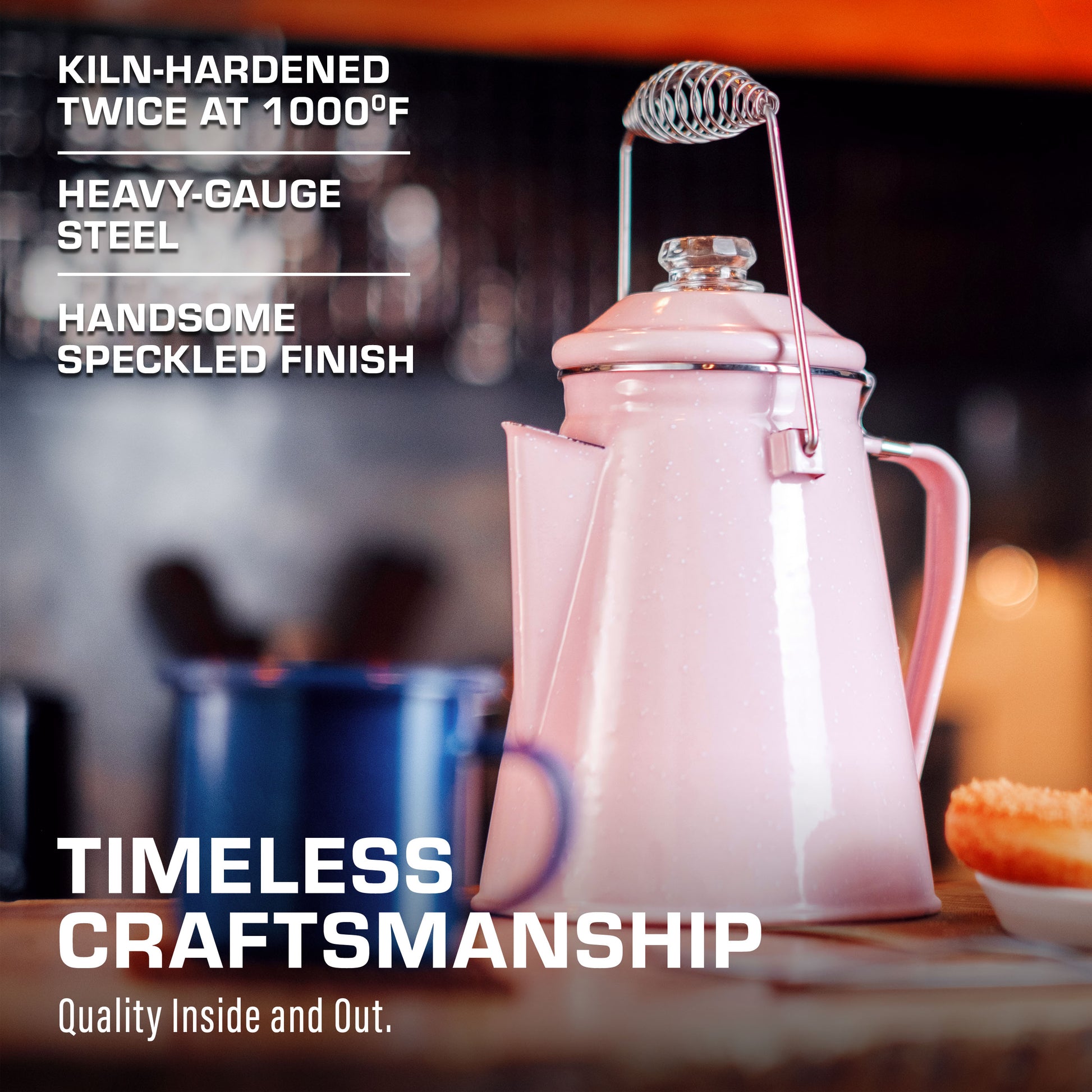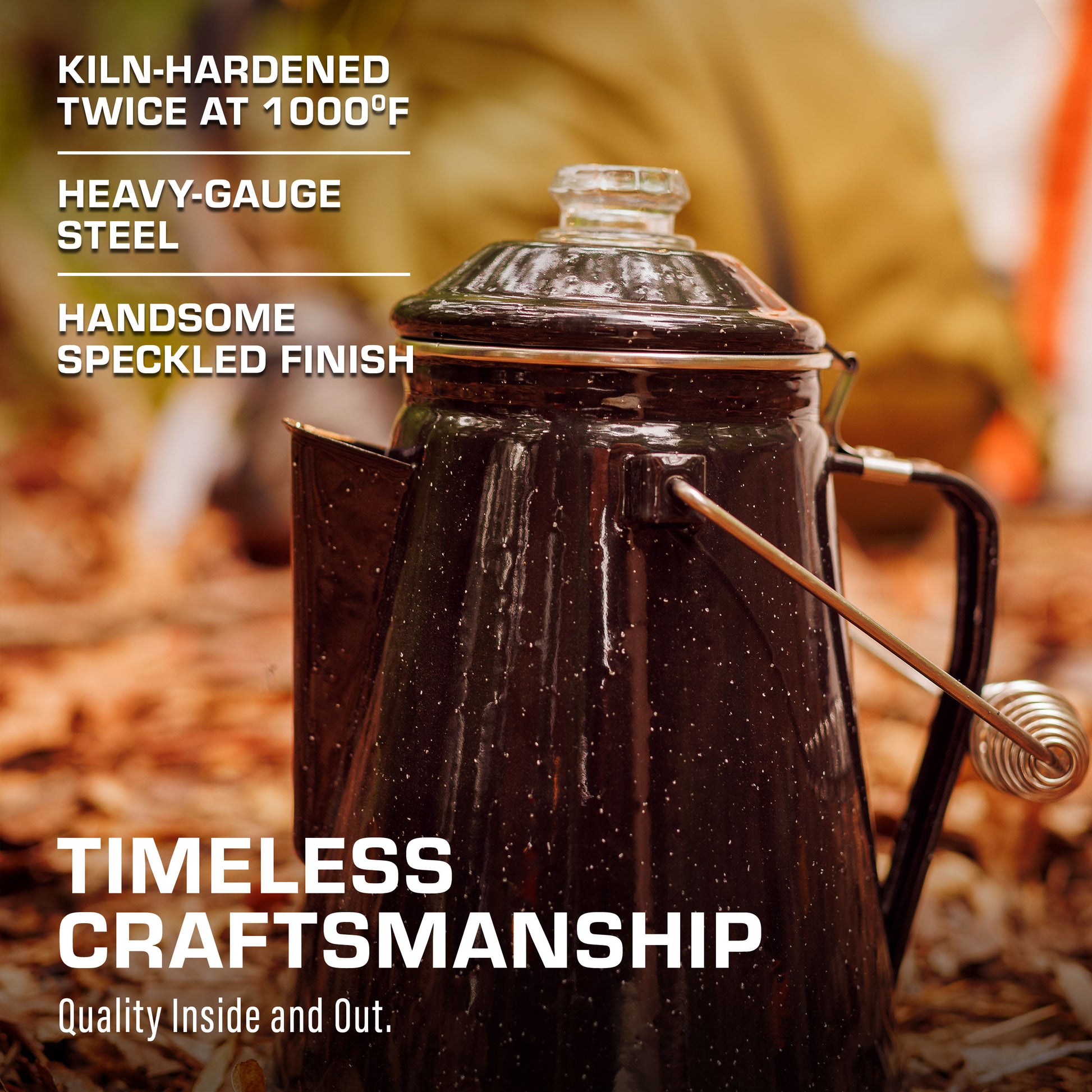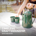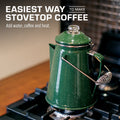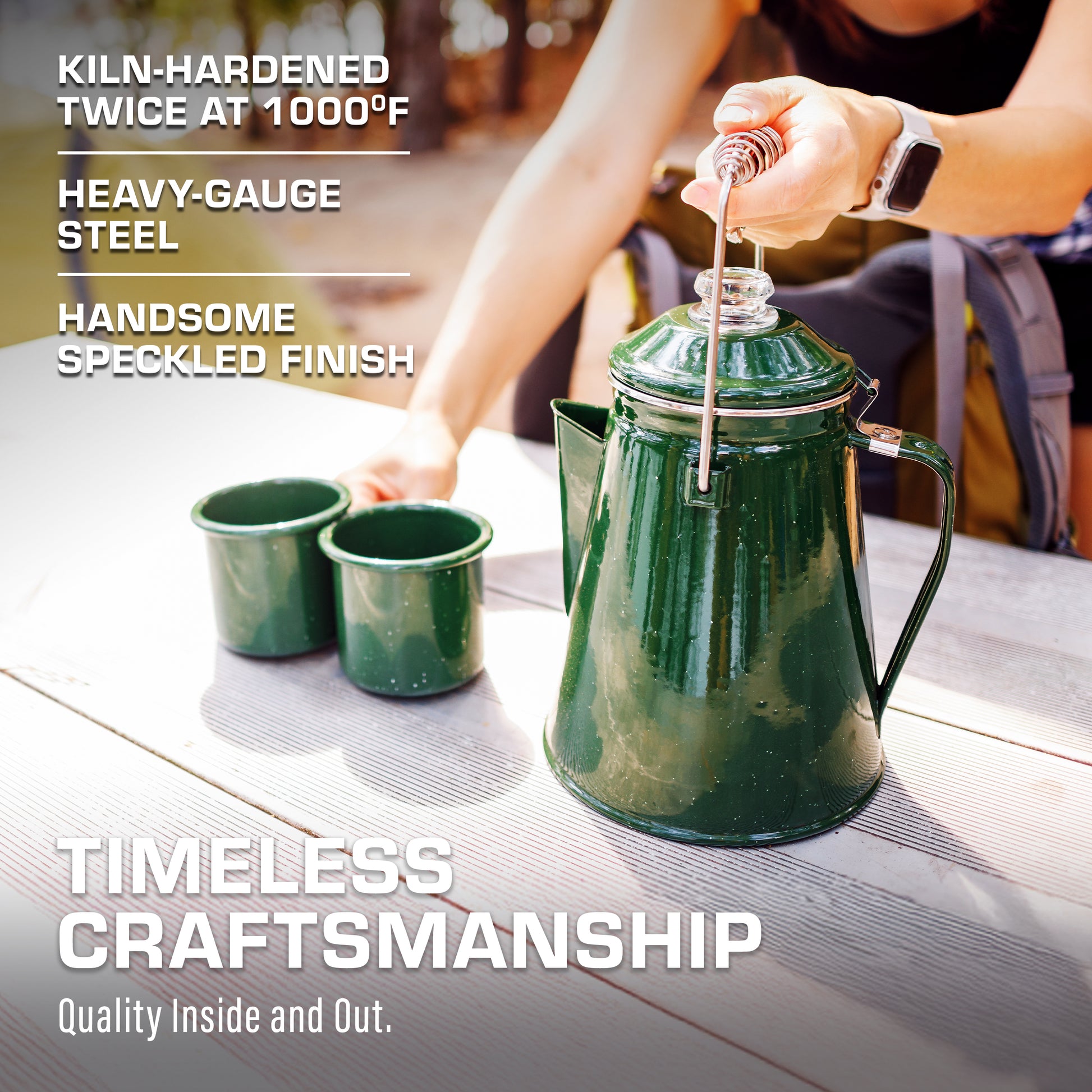 - TIMELESS CRAFTSMANSHIP – Built from heavy-gauge steel, every piece of this stovetop coffee maker is kiln-hardened twice at 1,000℉. A handsome blue camping coffee pot built to last