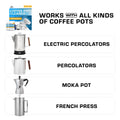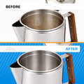 CLEANER FOR STAINLESS STEEL COFFEE MAKERS — Descaler for Percolator, Moka Pot, & French Press: Made for rugged gear and home brewers alike, this coffee descaler restores shine and performance in stainless steel percolators, moka pots, and french presses without harsh odors, weird flavors, or damage to your coffee maker