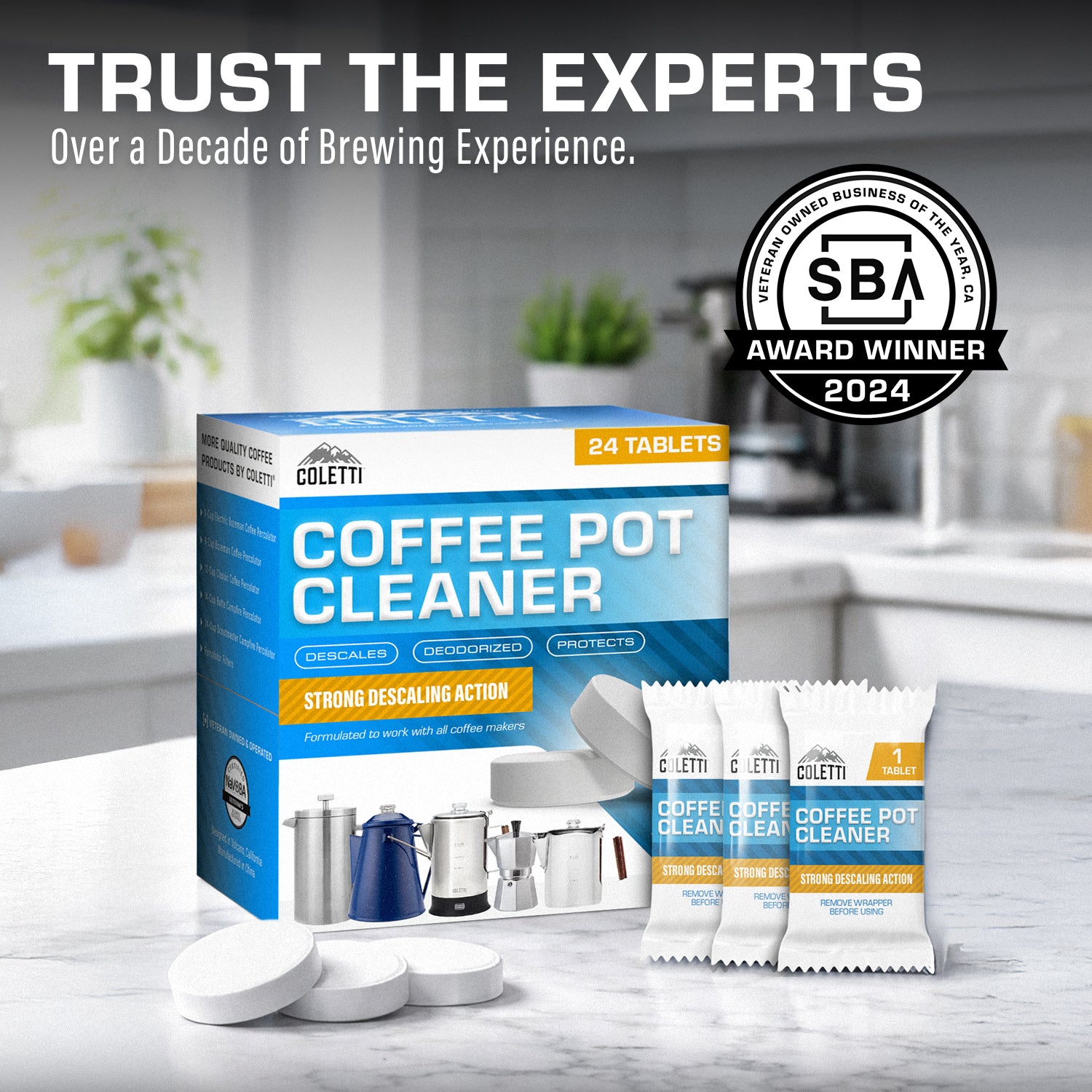 NEAT & COMPACT STORAGE — Individually Wrapped Pack of 24: Made for rugged gear and home brewers alike, this 'Coffee Descaler' restores shine and performance in stainless steel percolators, moka pots, and french presses without harsh odors, weird flavors, or damage to your coffee maker