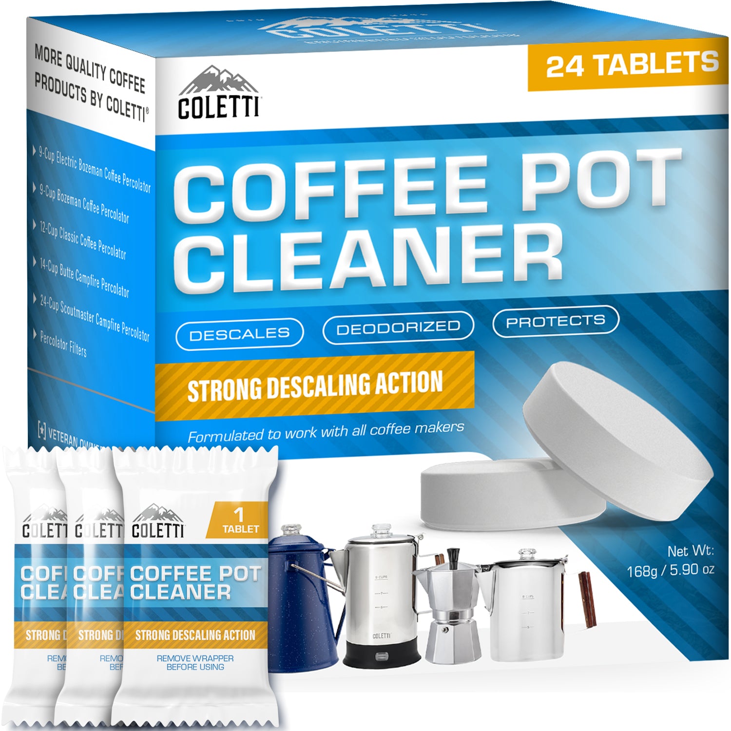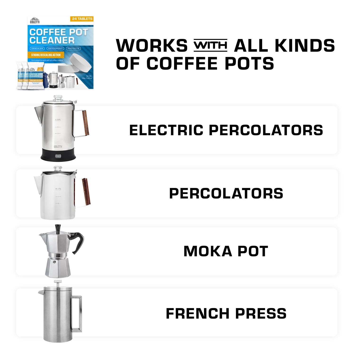 COFFEE MAKER CLEANING TABLETS — Ideal Coffee Descaler: Deep-clean your percolator with coffee pot cleaner tablets that dissolve fast and cut through limescale, coffee oils, and stains. Use occasionally as your go-to 'coffee pot cleaner and descaler to keep every brew bold, smooth, and clean