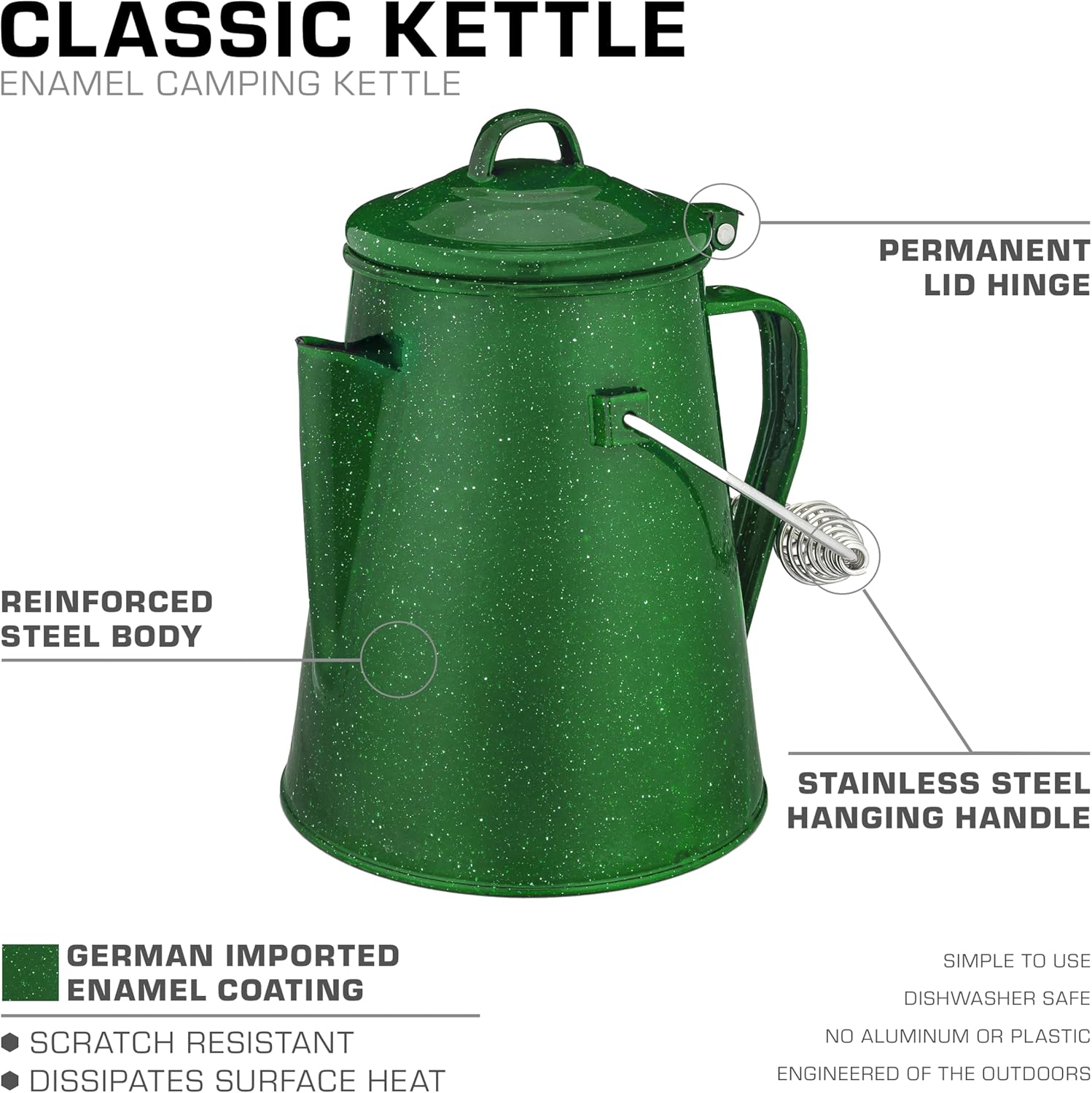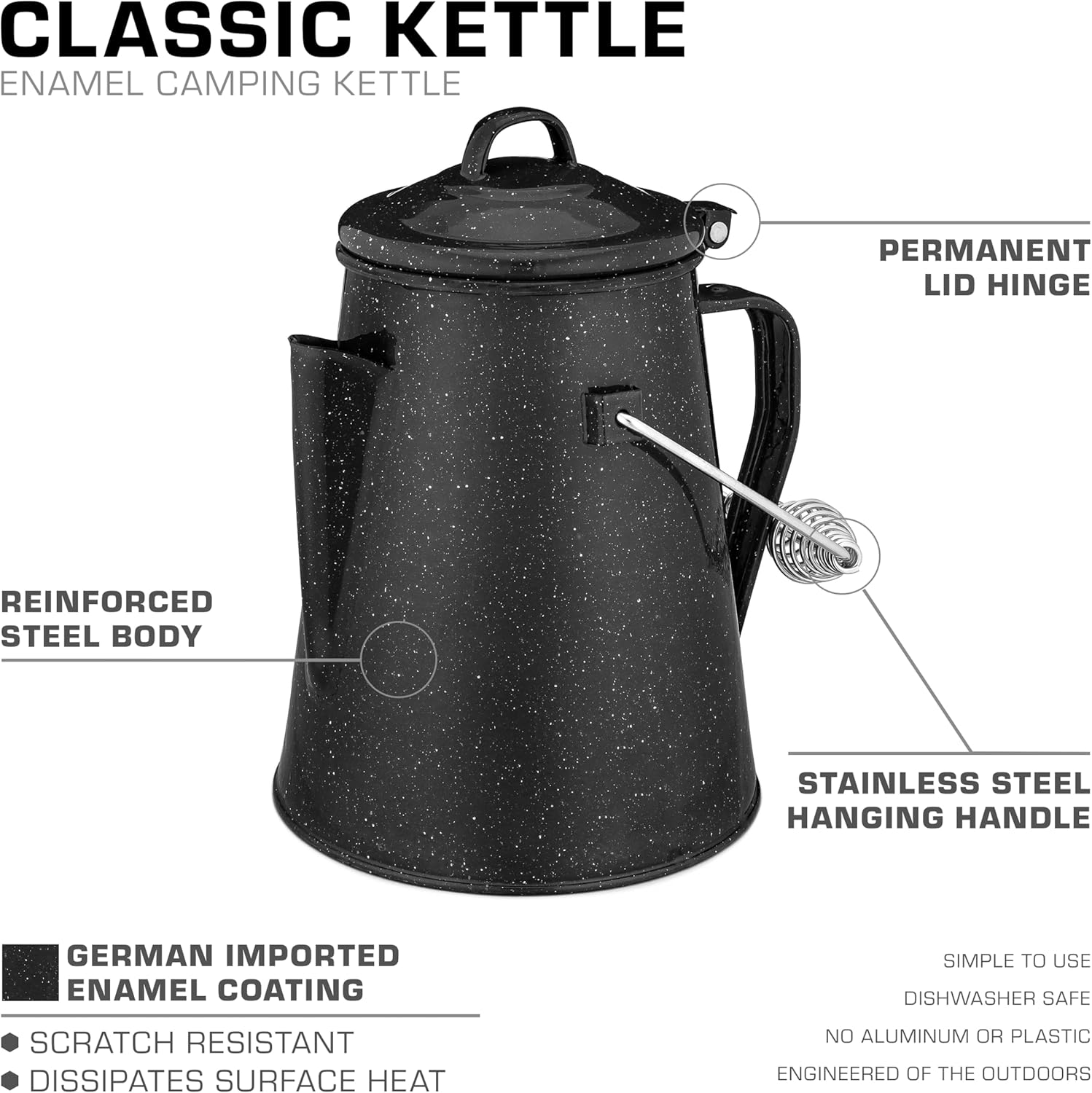 - TIMELESS CRAFTSMANSHIP—Built for the Wild, Crafted for a Lifetime – The COLETTI camping coffee pot is built to outlast the journey. Forged from reinforced steel and coated with imported German enamel, this camp kettle embodies classic outdoor cookware. Whether brewing cowboy coffee over open flames or boiling water on a stovetop, it delivers hot, pure, and steady coffee—because every great adventure starts with great coffee.