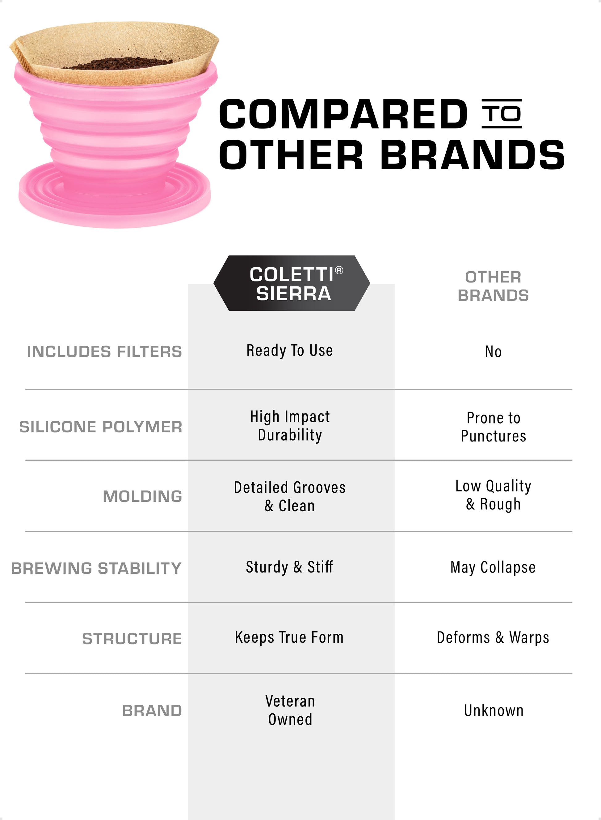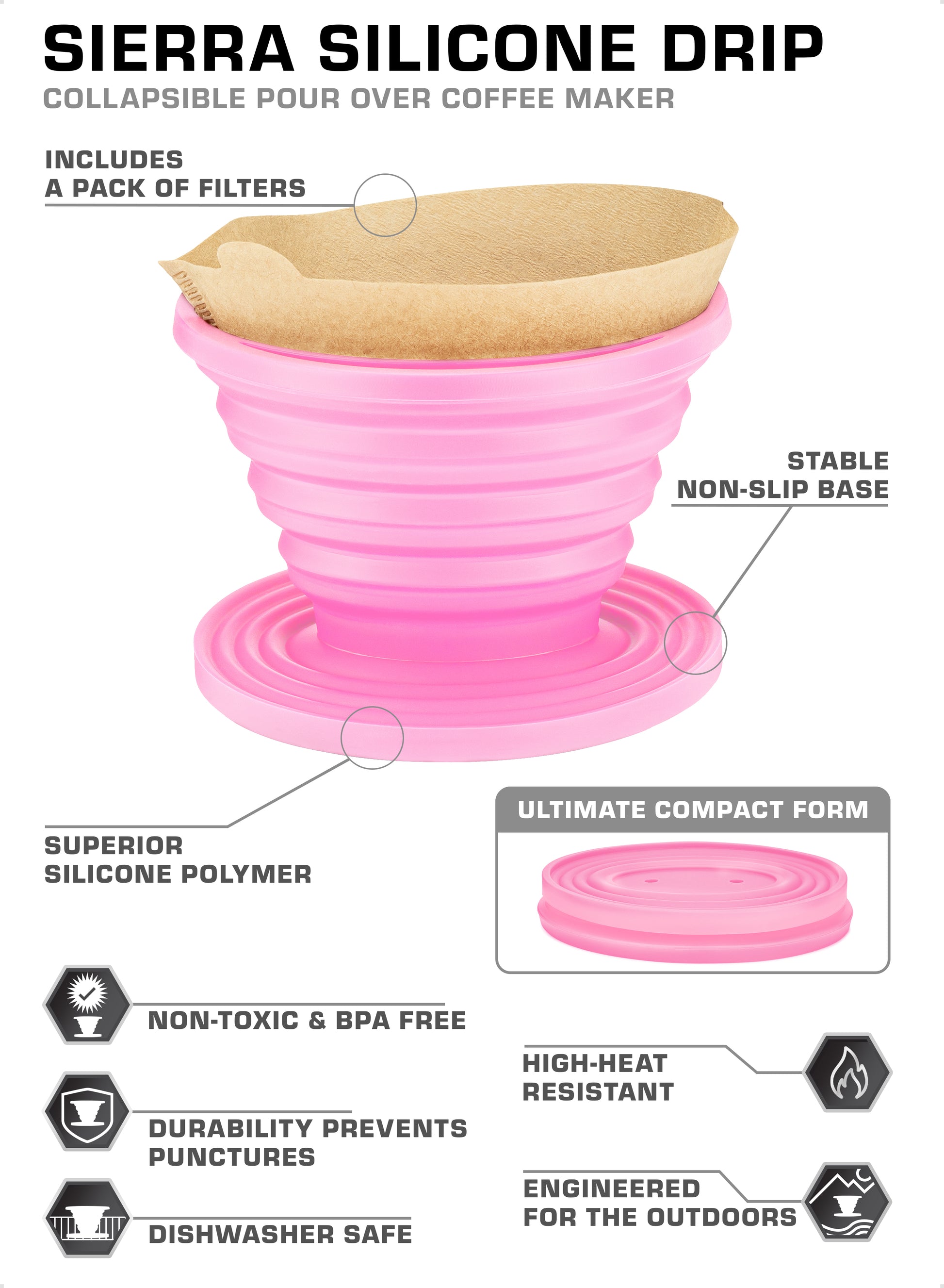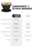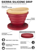 - SUPERIOR SILICONE COMPOUND — Even though the Sierra is not the only collapsible coffee drip on the market, we took the time to out-engineer our competition by sourcing the best possible silicone available. Our high heat resistant silicone coffee maker doesn’t have any offensive odors, nor is it easily susceptible to punctures